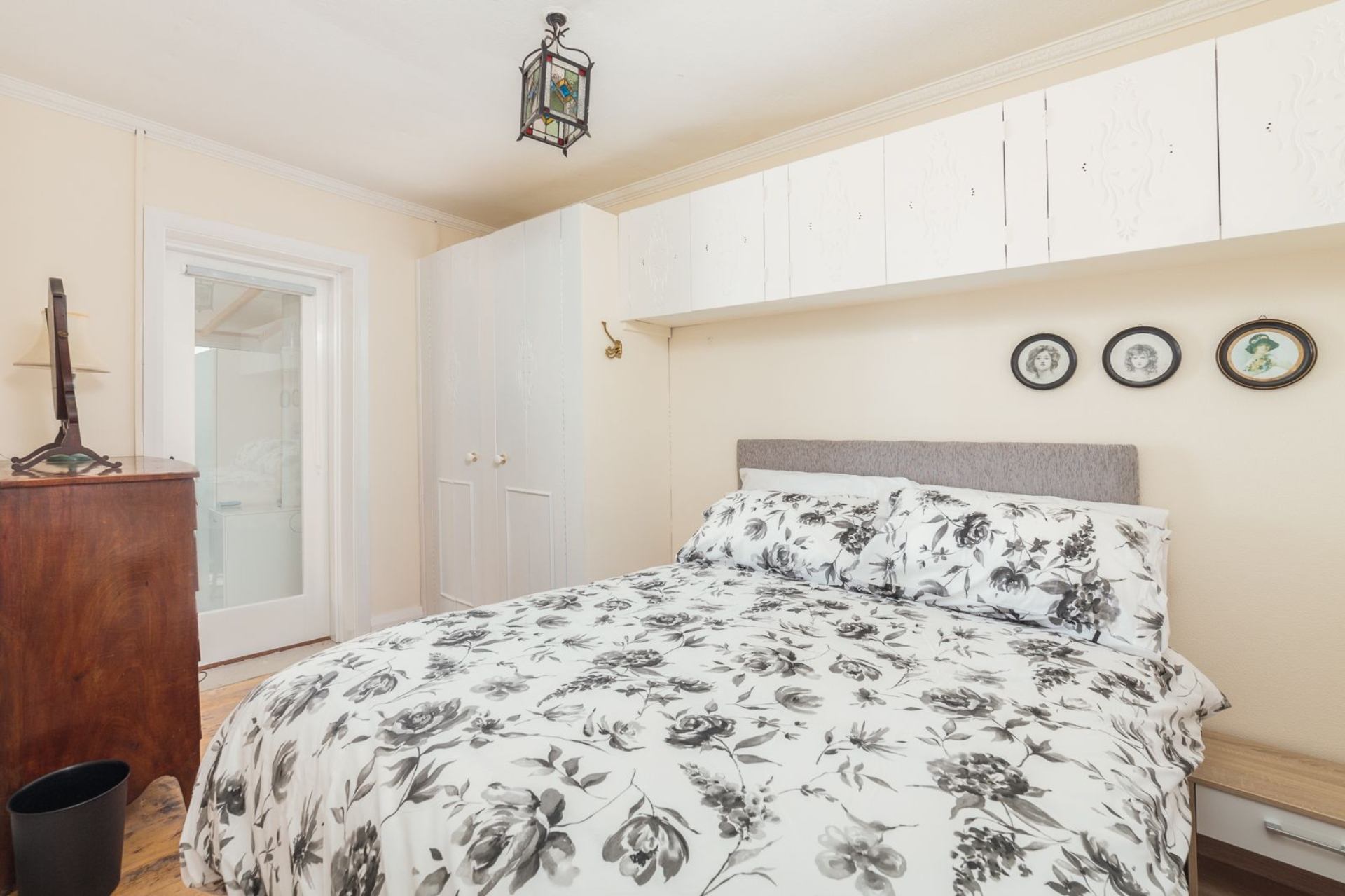 Bedroom 1: Double bed (4'6"), bedside tables, dressing table, built in storage cupboards.