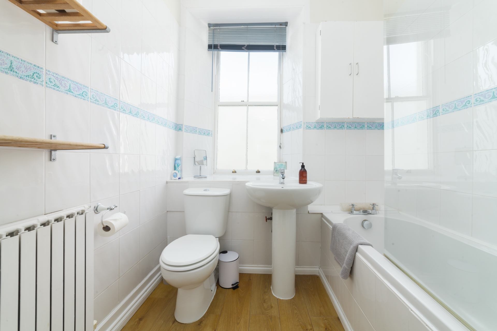 Family bathroom: Bath with electric shower over, wash hand basin, WC, shelf and cabinet.
