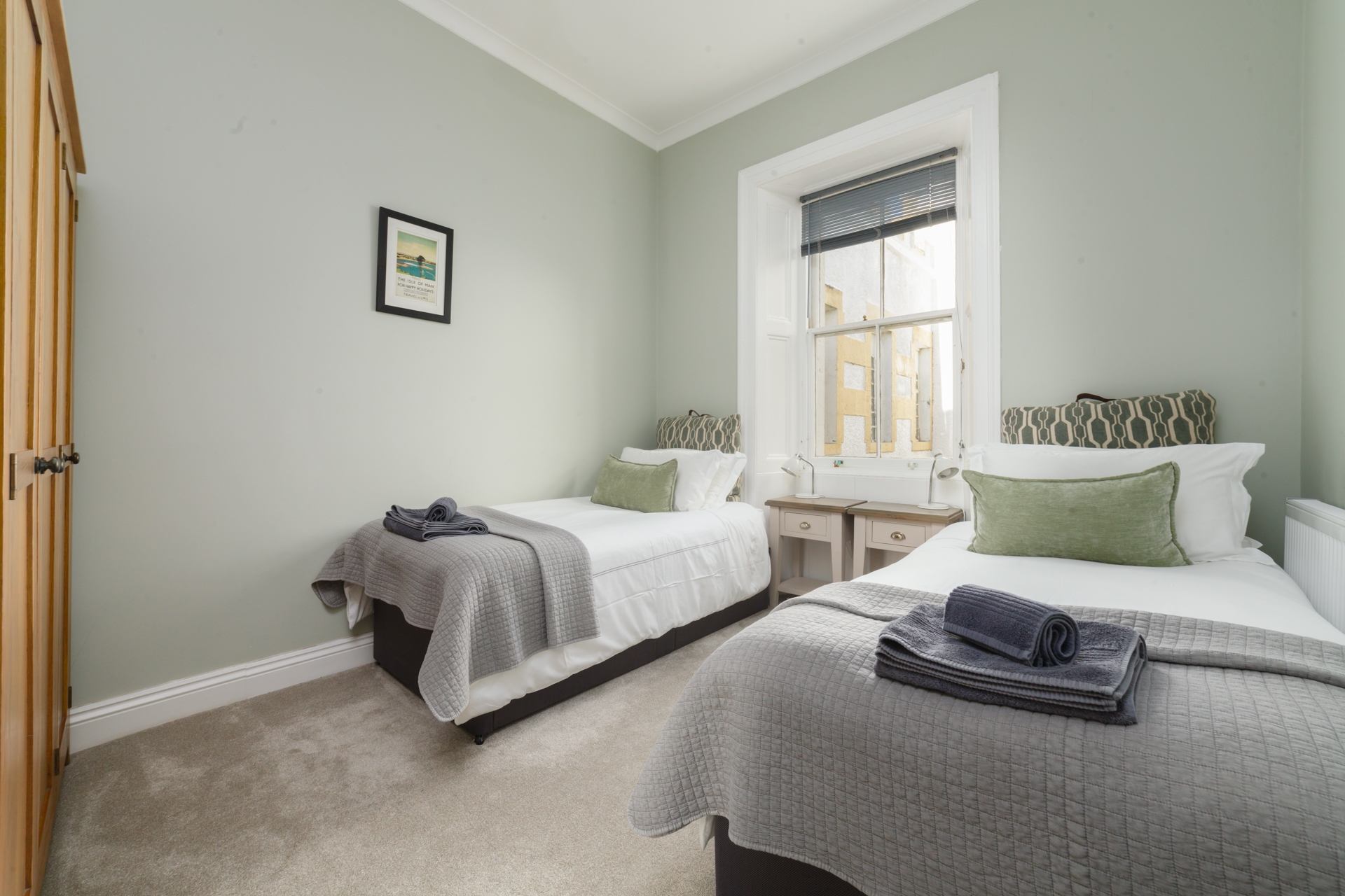 Bedroom 3: Twin room with bedside cabinets, wardrobe and hairdryer.
