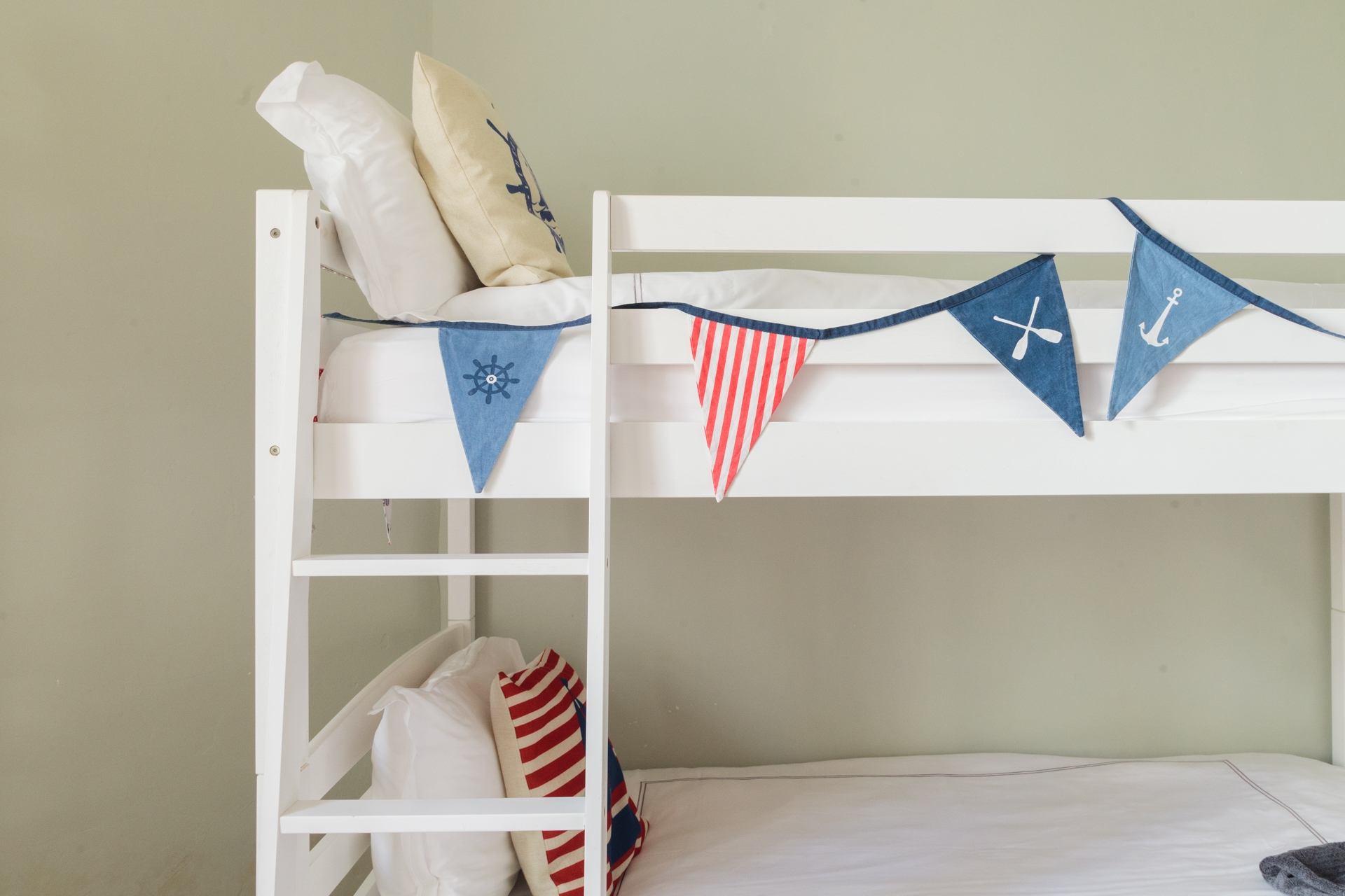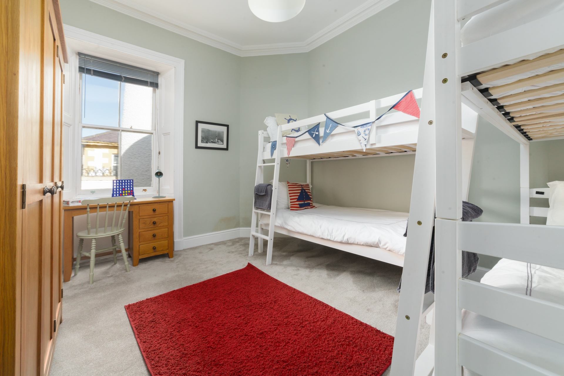 Bedroom 4: Bunk room with two sets of full-size single bunk beds, desk and wardrobe. Travel cot available on request. The bunk beds are full size singles but most suited to children or young adults.