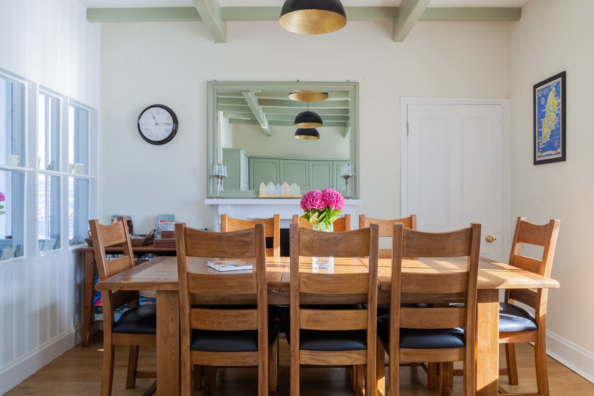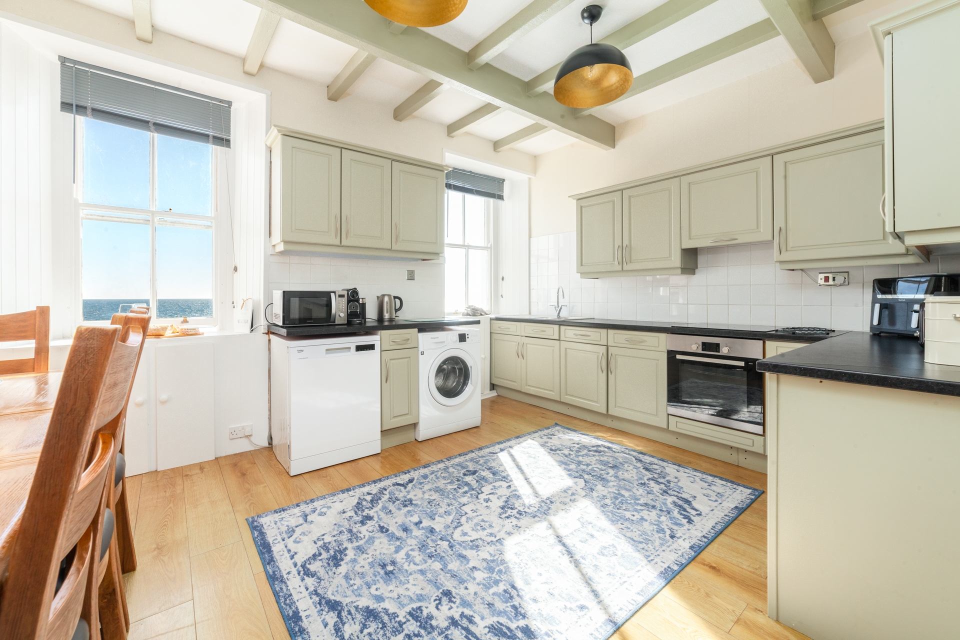 Kitchen and Dining Area: Fully equipped with electric hob, oven, fridge, microwave, kettle, toaster, Nespresso machine, double air fryer, slow cooker, toastie maker, washing machine and dishwasher. Further fridge freezer and tumble dryer in outdoor shed. Large table comfortably seating 8 people. Cabinet with board games and visitor information.