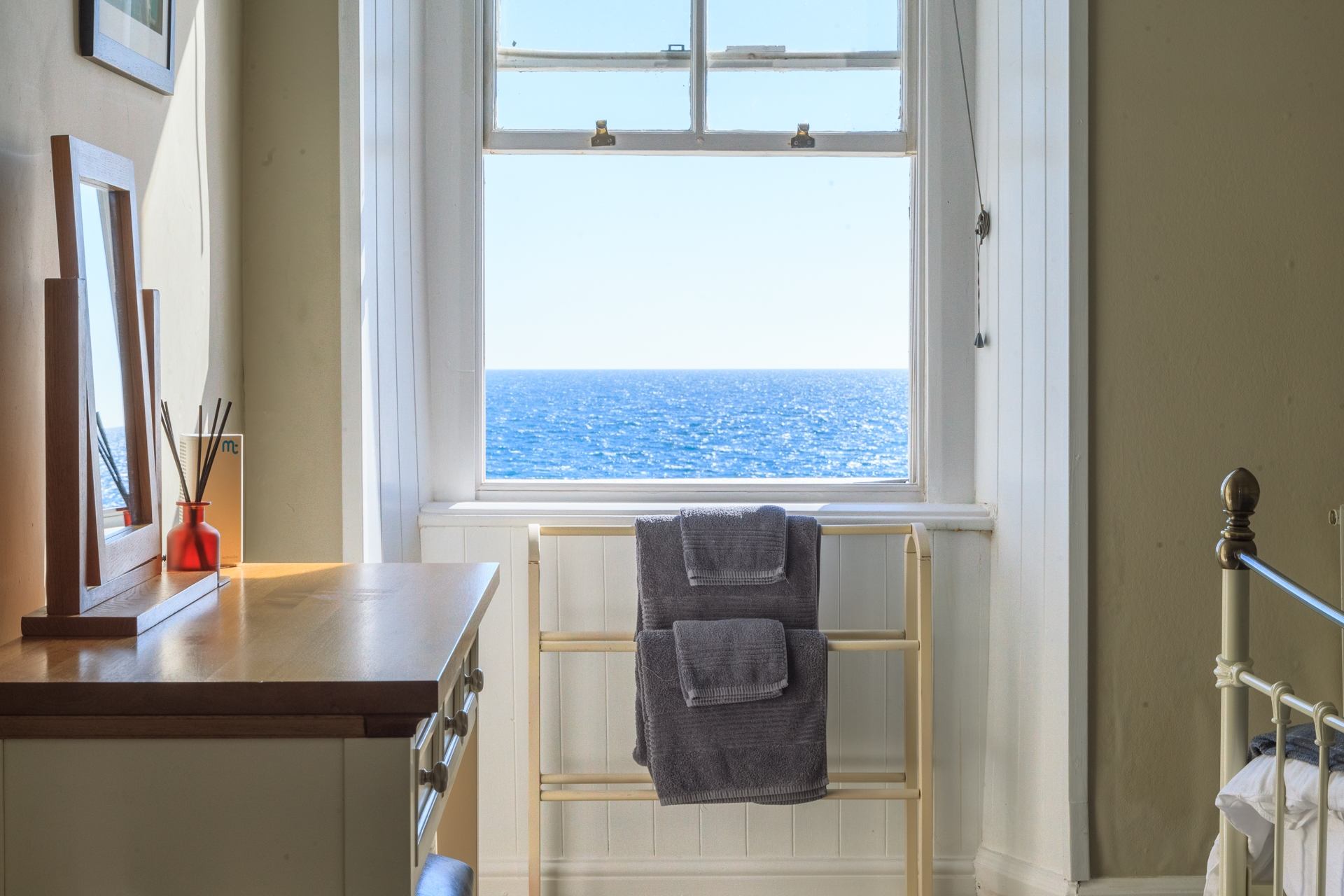 Bedroom 1: Master suite with sea view, super king double, bedside cabinets, wardrobe and hairdryer. Ensuite bathroom with bath, shower over, wash hand basin and WC, heated towel rail.