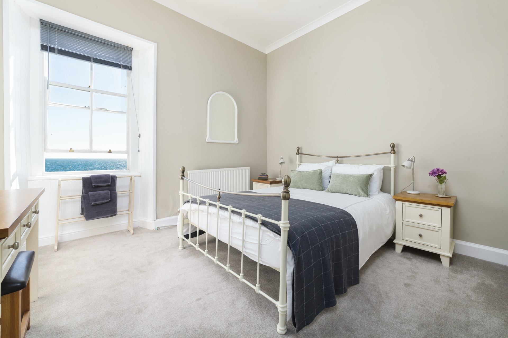 Bedroom 2: King size with sea view, bedside cabinets, dressing table, hairdryer, wardrobe.