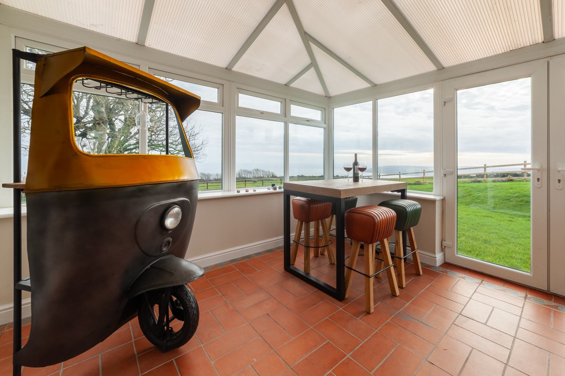 The inviting living room provides comfortable seating for the whole group, complete with a Smart TV and access to the airy conservatory, where you can unwind with informal seating and views of the central and northern Manx hills.