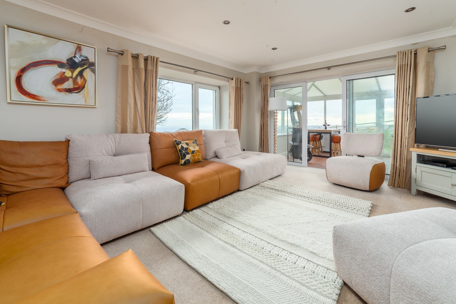 Living Room: Comfortable sofas seating all 10 guests, Smart TV, coffee table and access to conservatory area.