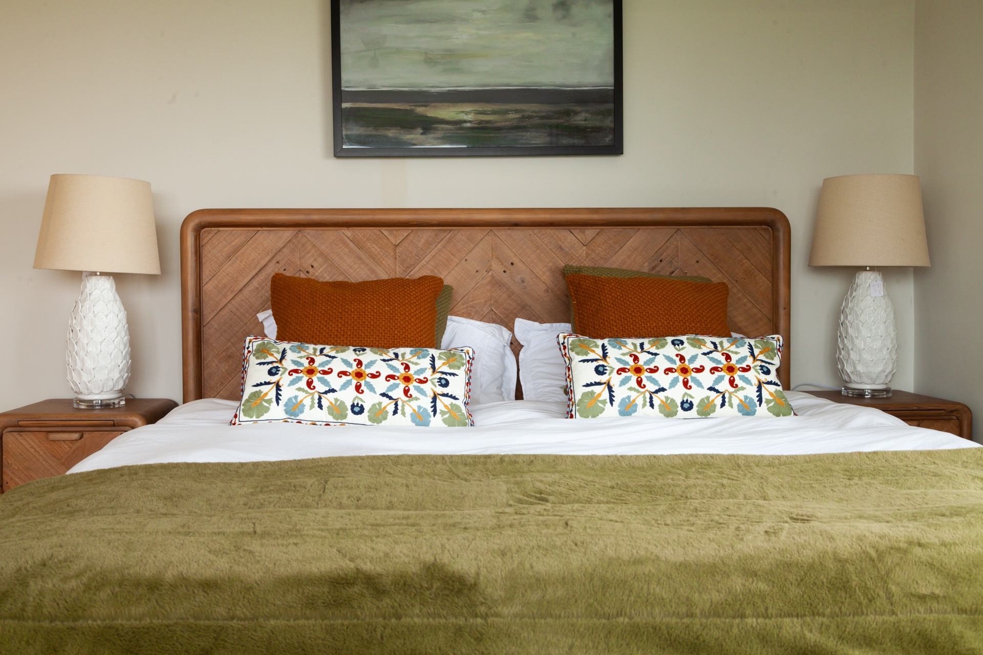 Bedroom 1: Super-king zip and link bed which can be configured as double or twin, bedside tables, walk in wardrobe.