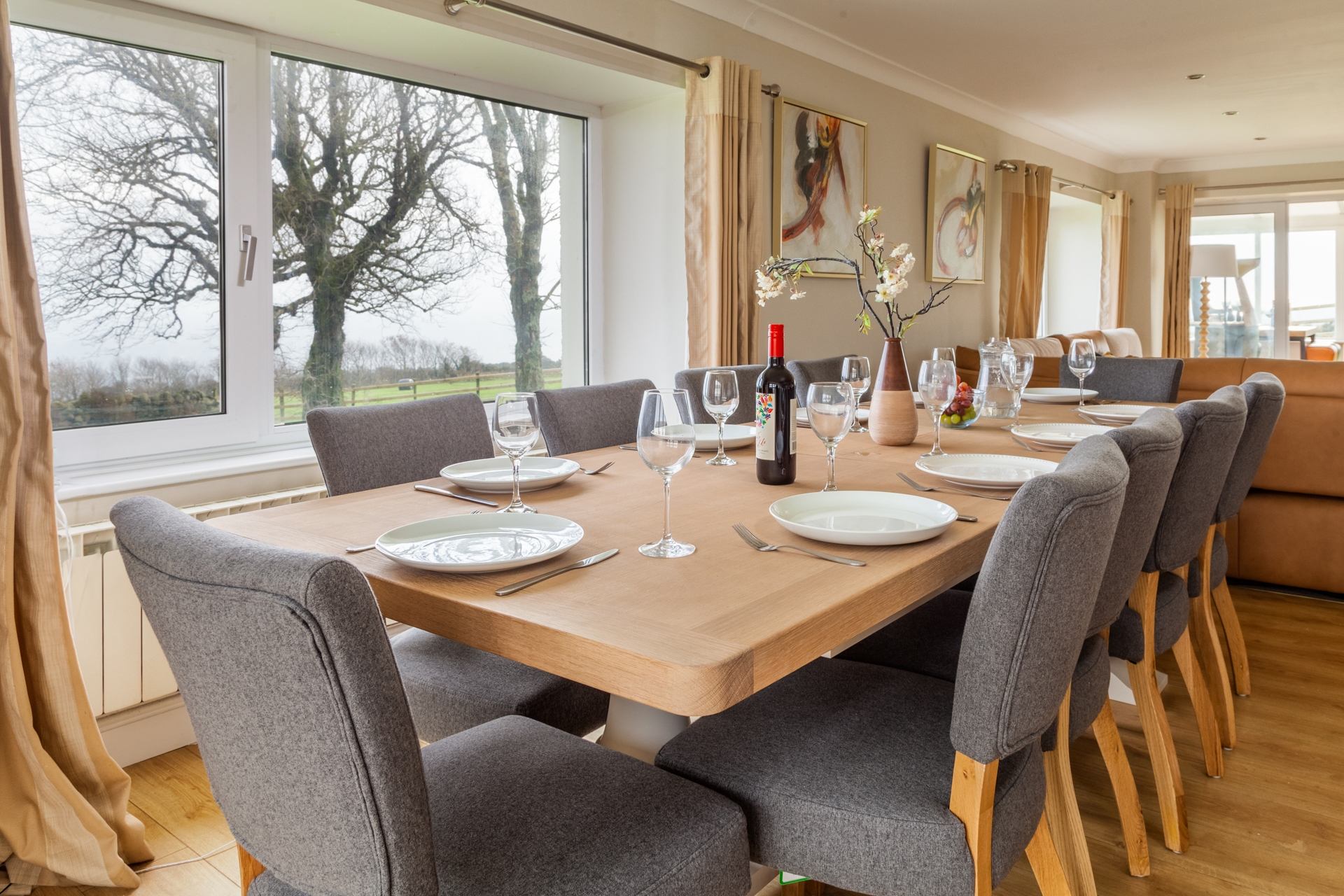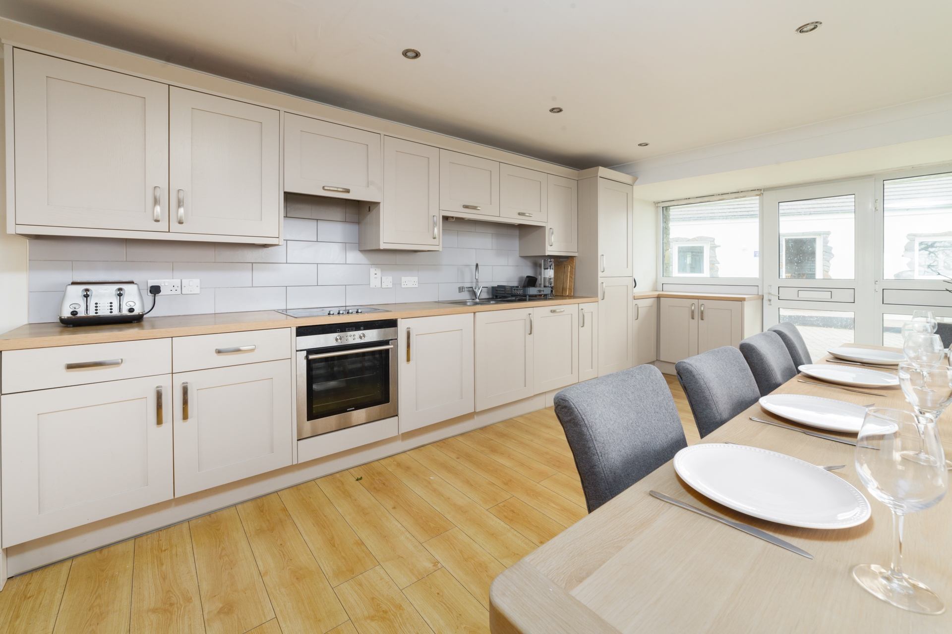 Step into a bright and modern kitchen and dining area, fully equipped with everything you need for a stress-free stay, including a hob, oven, fridge, freezer, microwave, washing machine, and dryer. Gather around the large dining table with seating for ten - ideal for family meals or leisurely brunches.