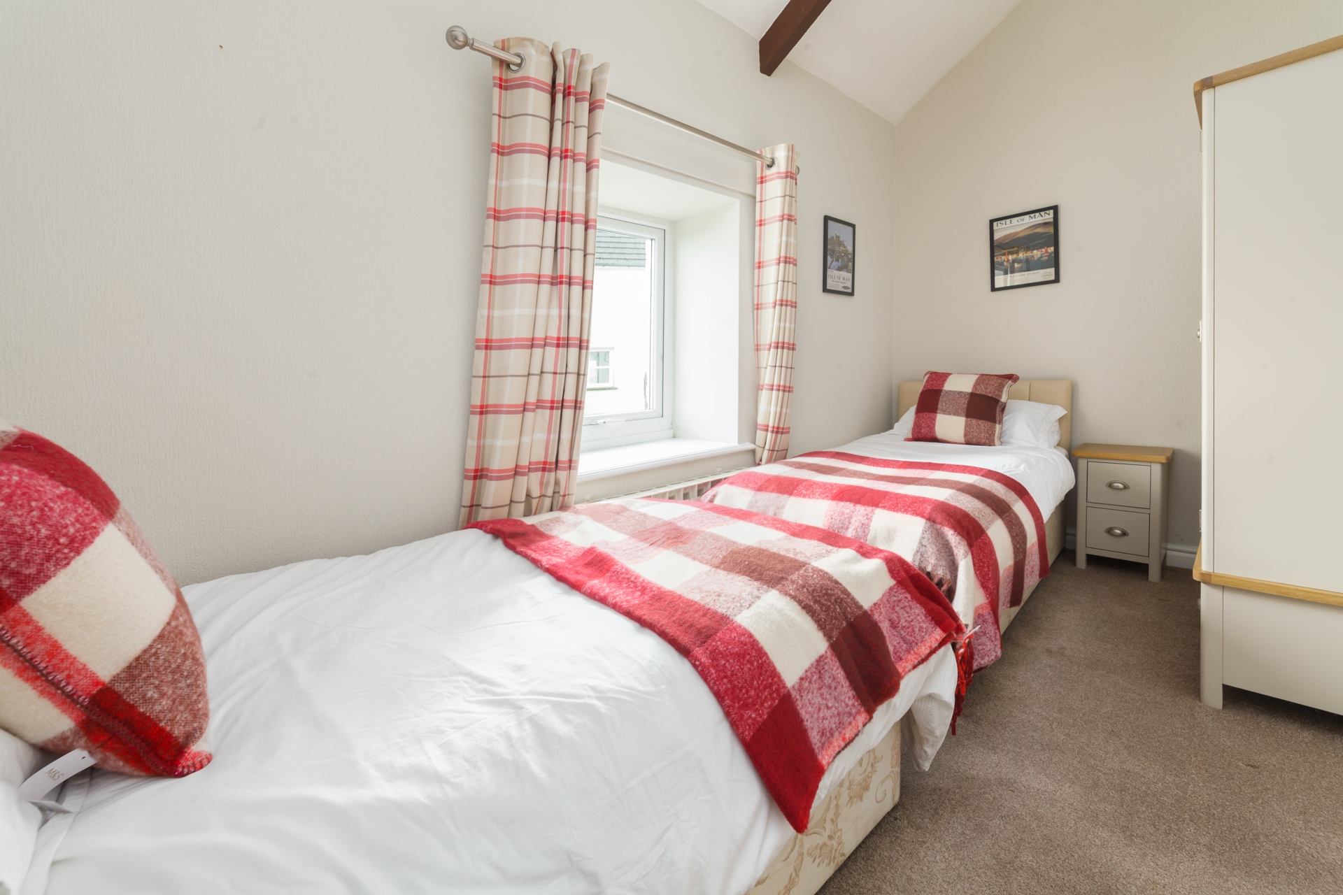 Bedroom 2: Twin beds, bedside tables, wardrobe.
