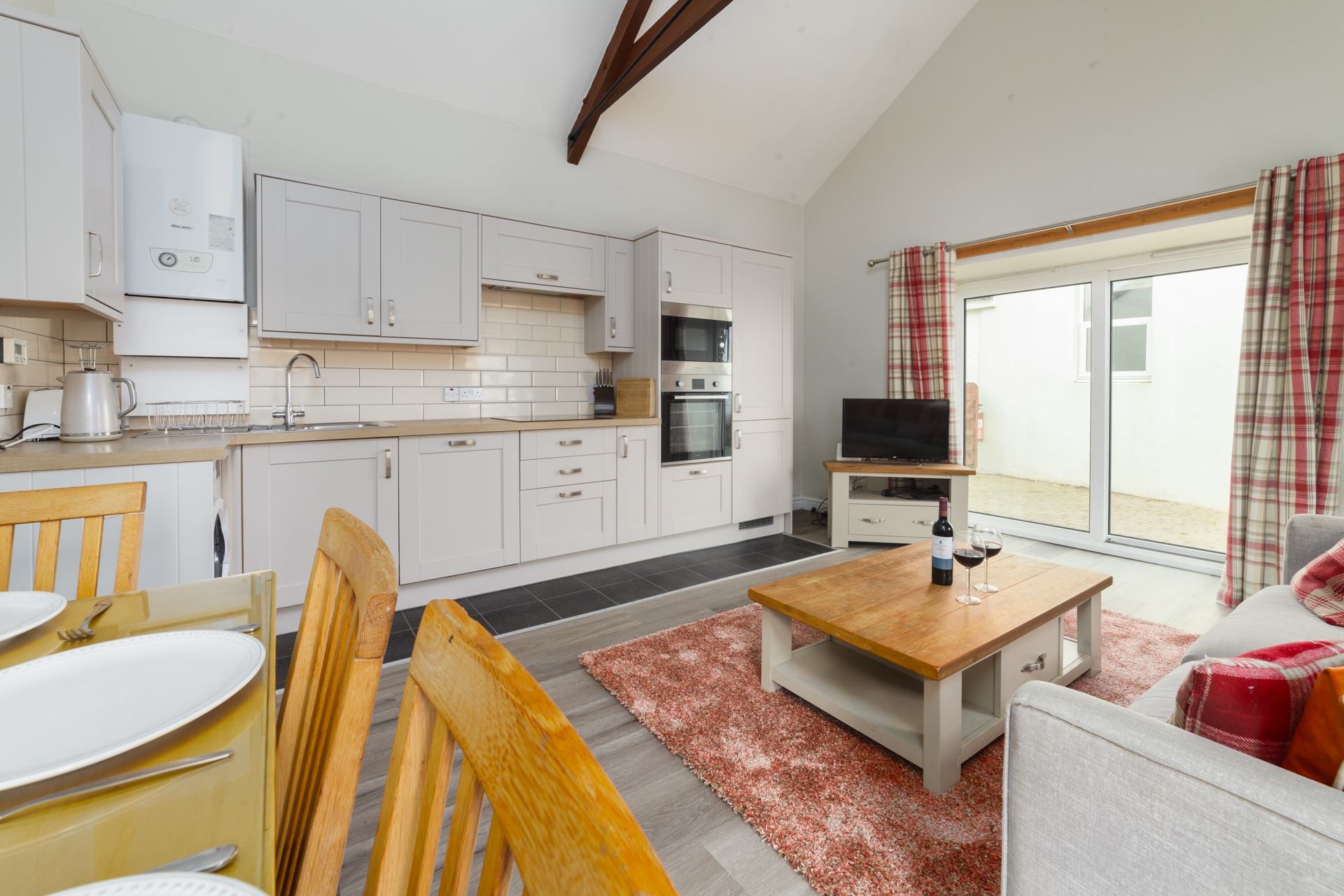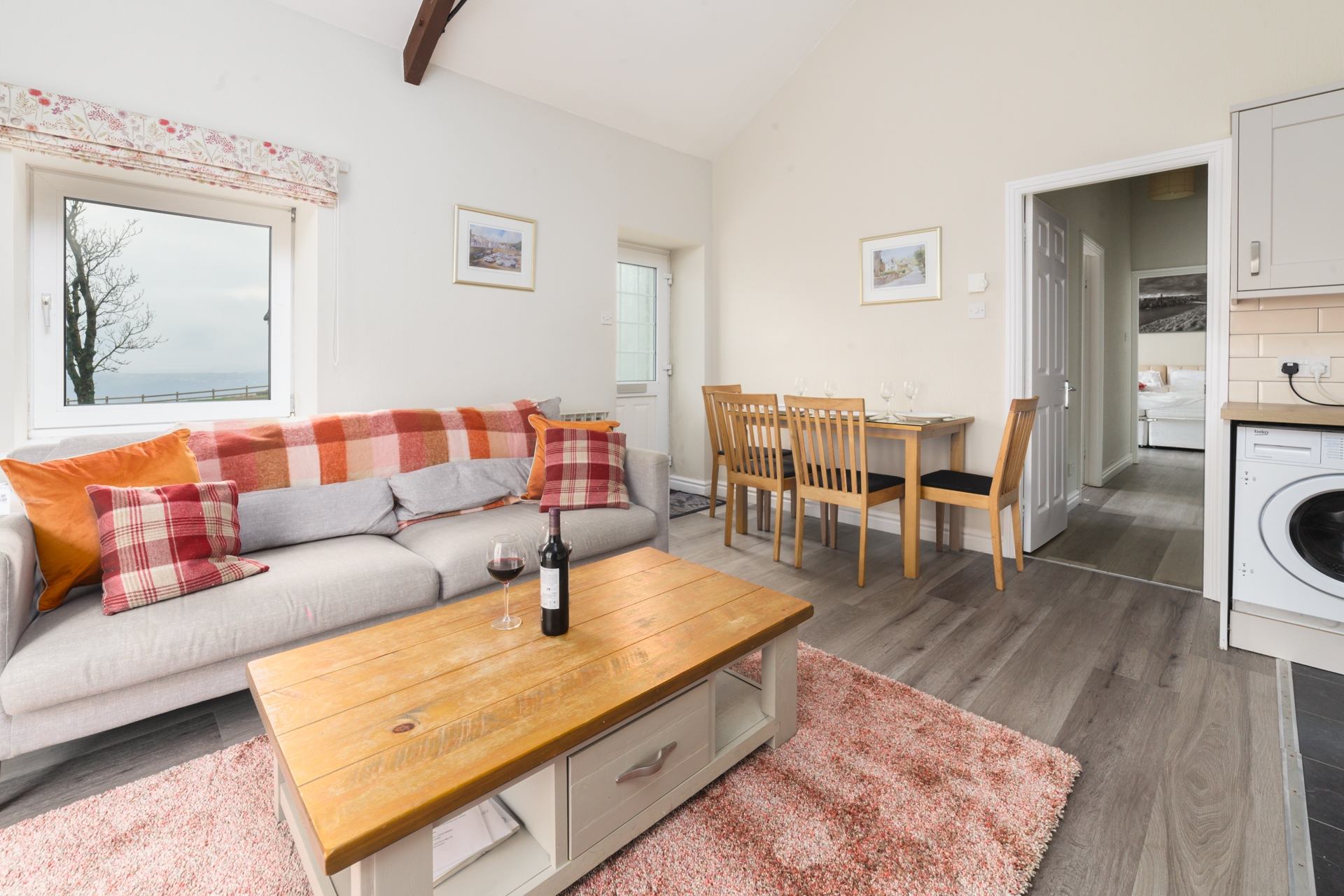 Kitchen, Living Room & Dining area: Comfortable sofa seating for 4, Smart TV, coffee table, dining table and four chairs. Well-equipped modern kitchen, containing hob, oven, fridge, freezer and microwave. Washer / dryer available to use.