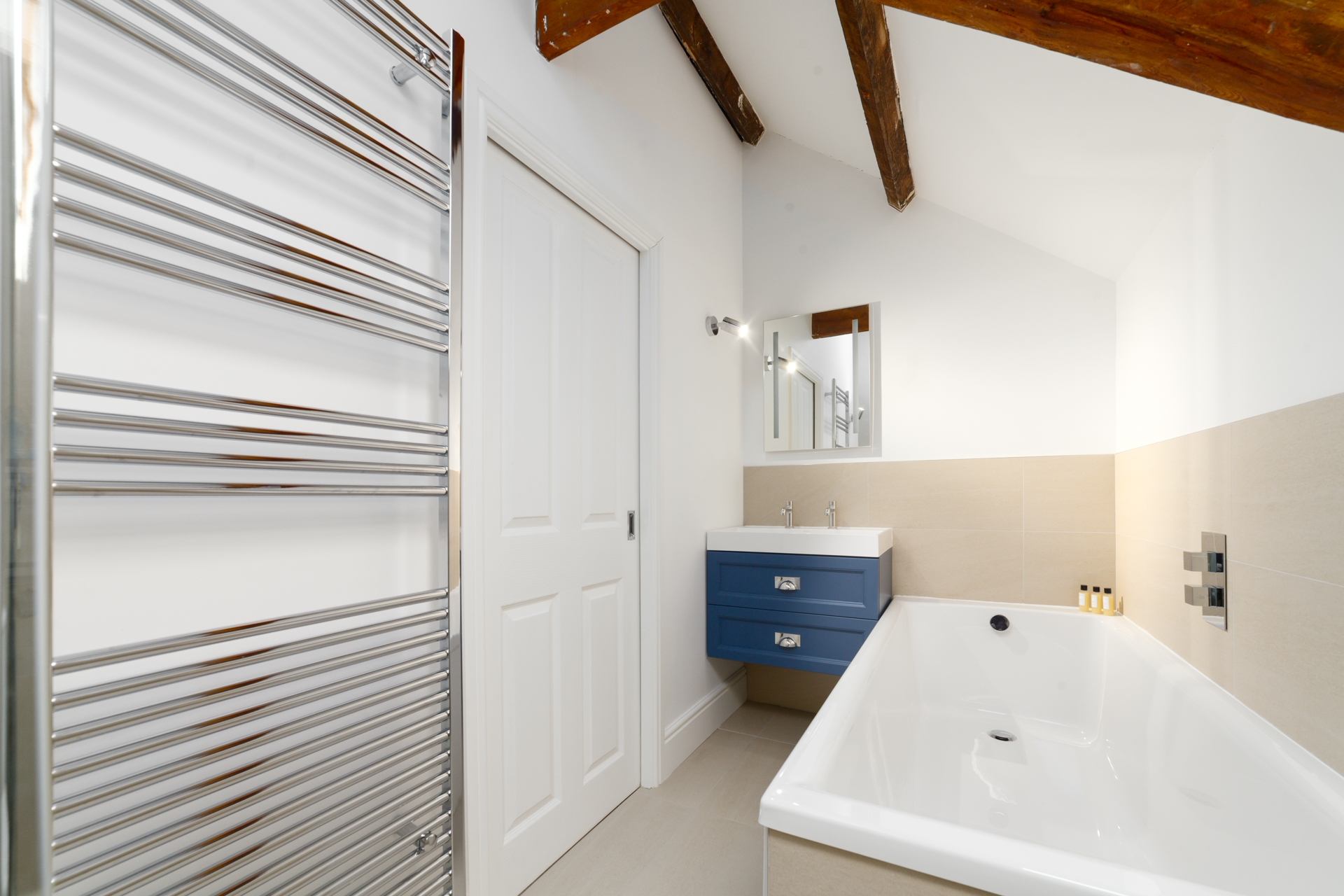 En-suite bathroom: Walk-in shower with rainfall head, WC, heated towel rail and hand wash basin.
