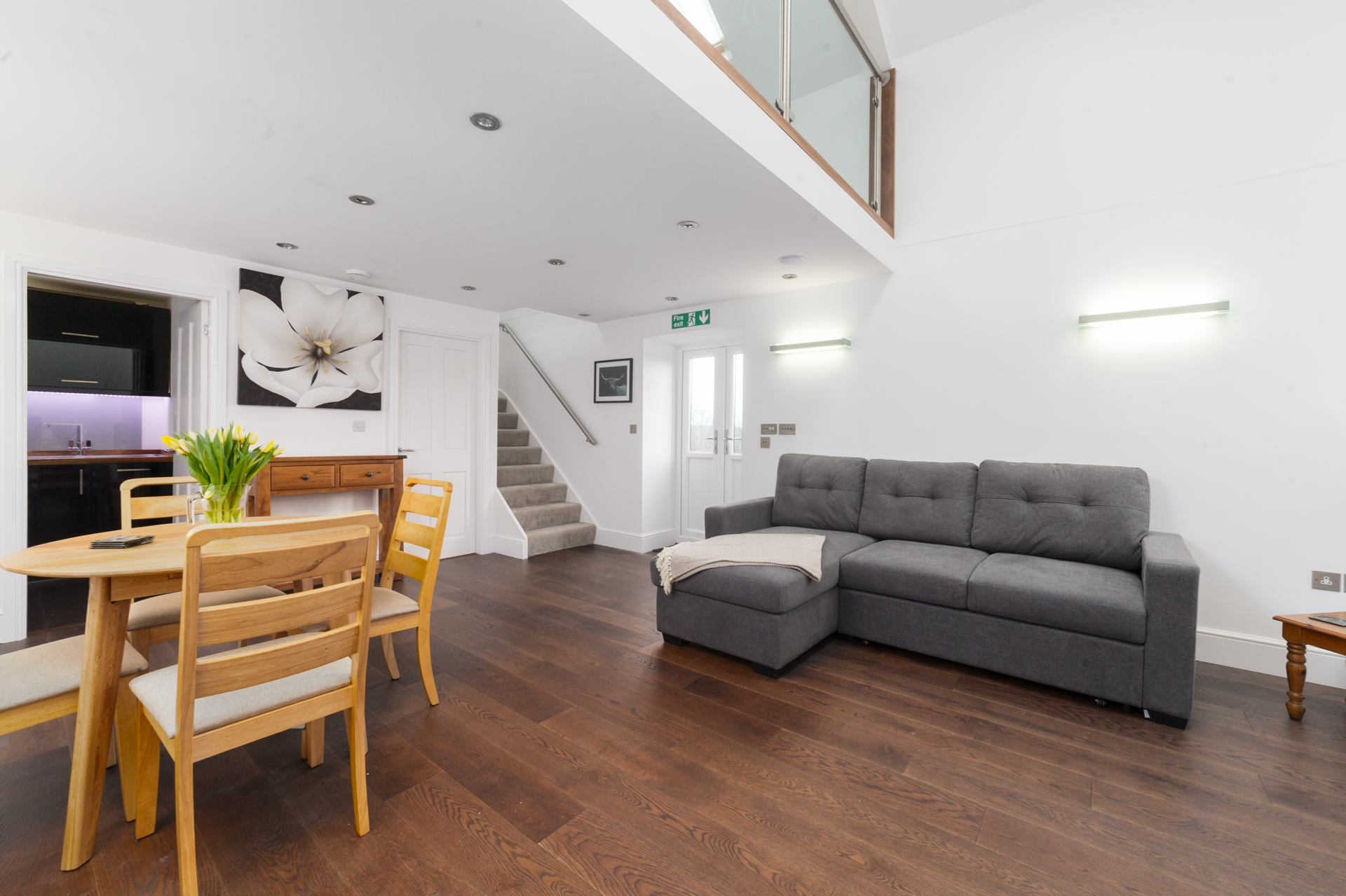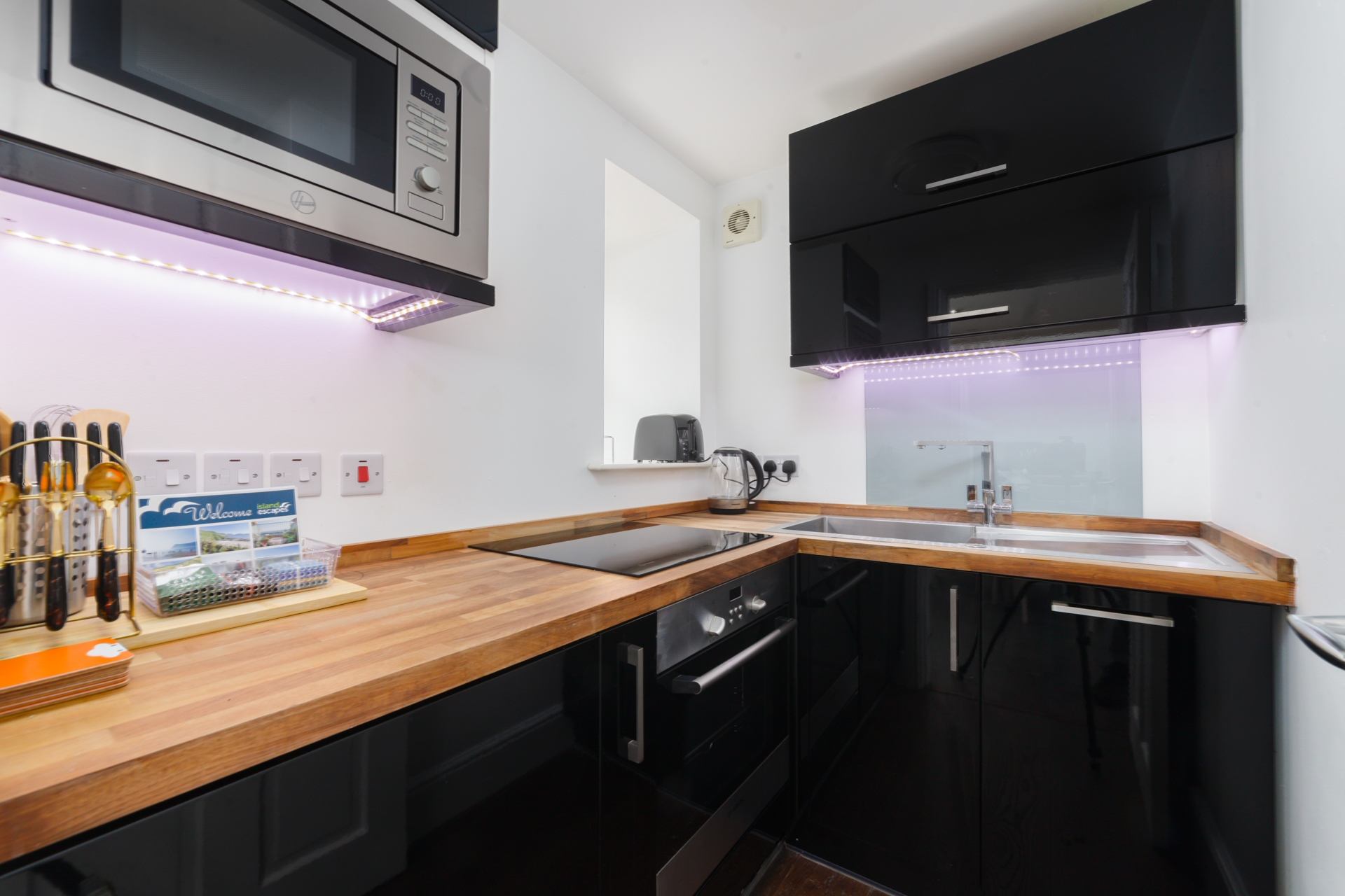 Kitchen & Dining area: Compact but fully equipped kitchen with oven, microwave and kettle.