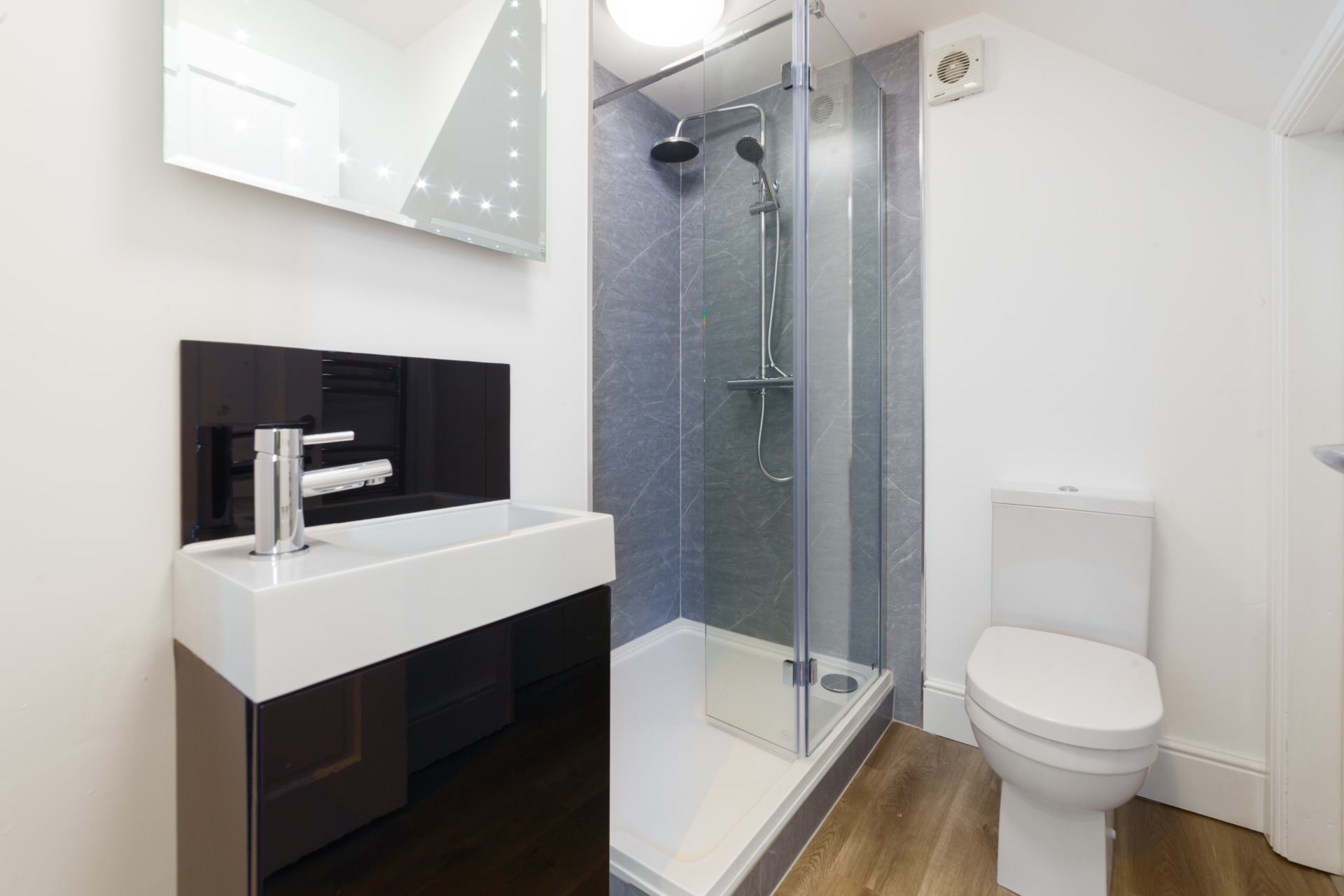 Bathroom: Walk-in shower, washbasin and wc.
