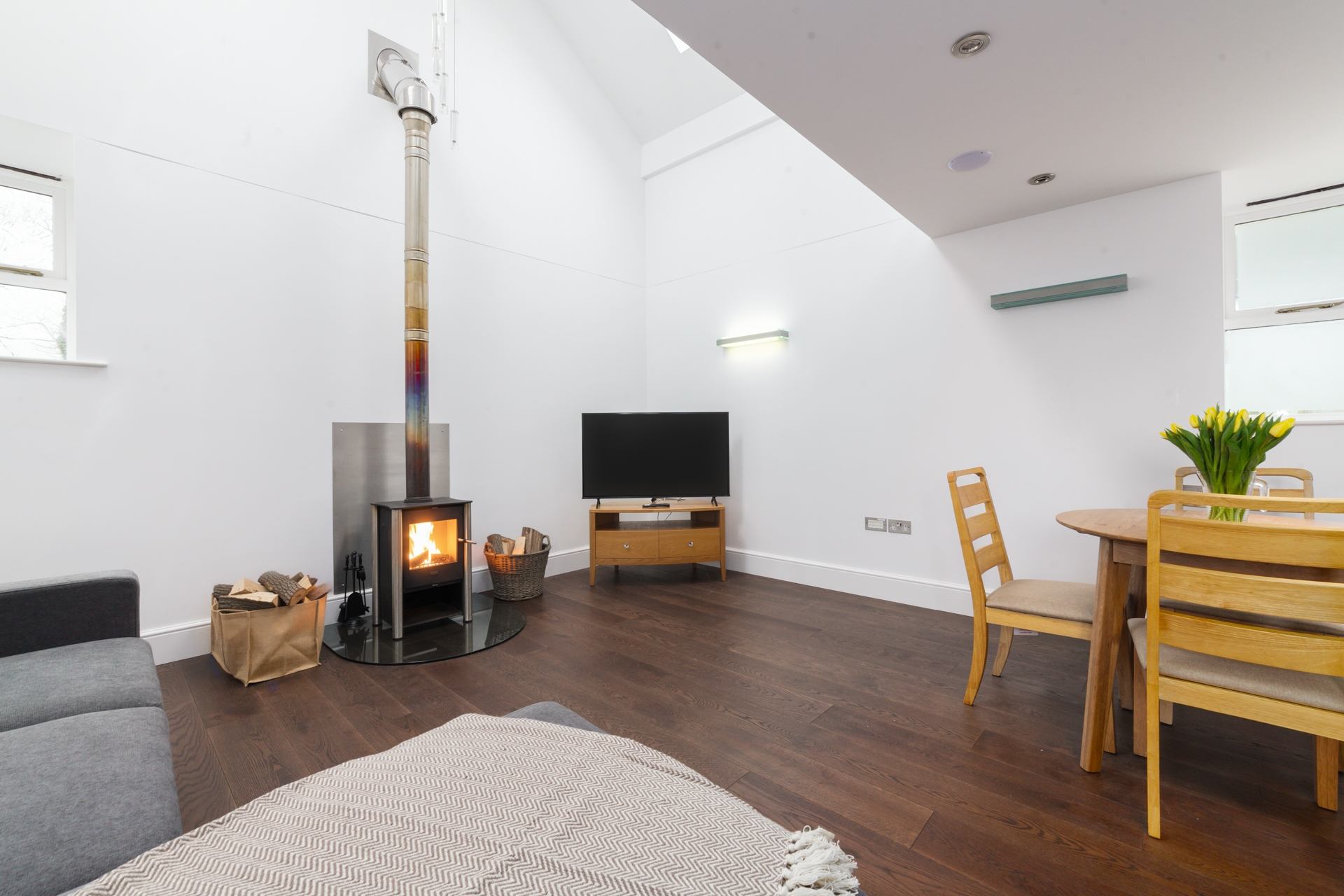 Living room: Comfortable L-shaped sofa, TV, log burner and dining table.