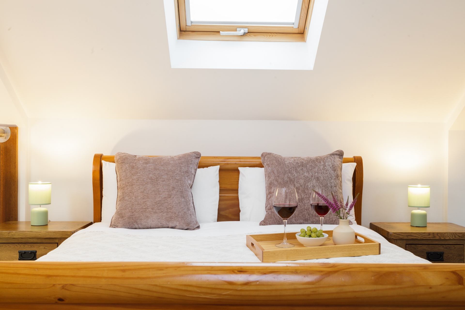 Inside, the cottage is compact yet beautifully designed, making excellent use of space. The open-plan living area features a dining table and a welcoming log burner, creating a wonderfully snug atmosphere after a day outdoors. The kitchen and bathroom are thoughtfully arranged and well equipped, while the mezzanine-level bedroom provides a cosy sleeping space tucked neatly above the living area.