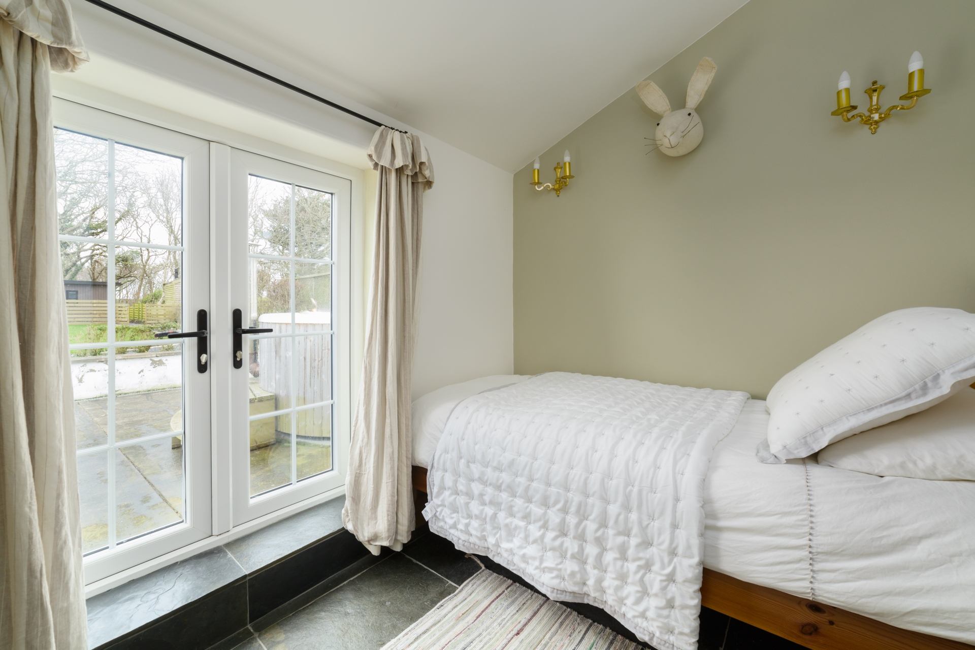 Bedroom 1: Single bed, bedside tables, built-in wardrobe and access to the patio area.
