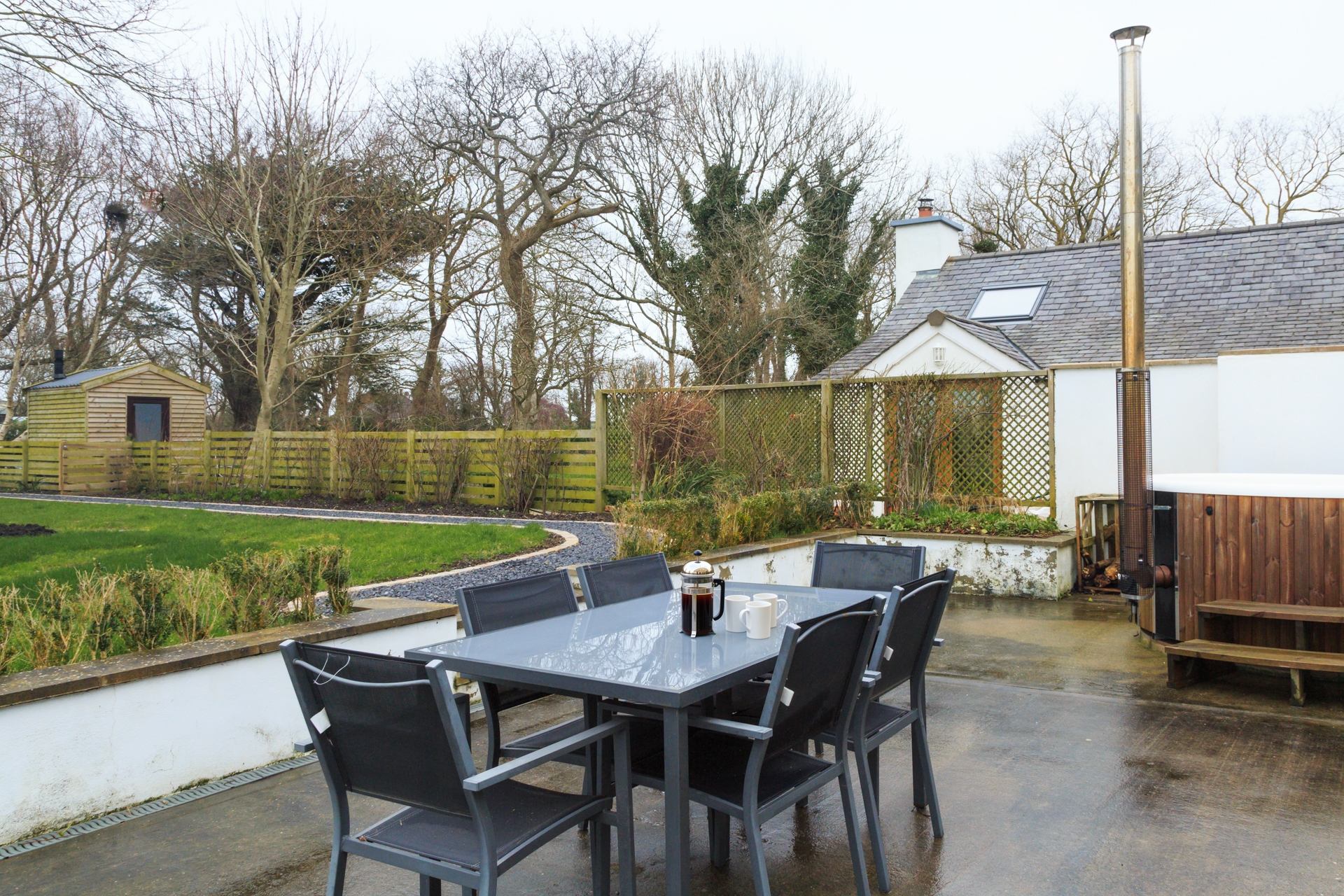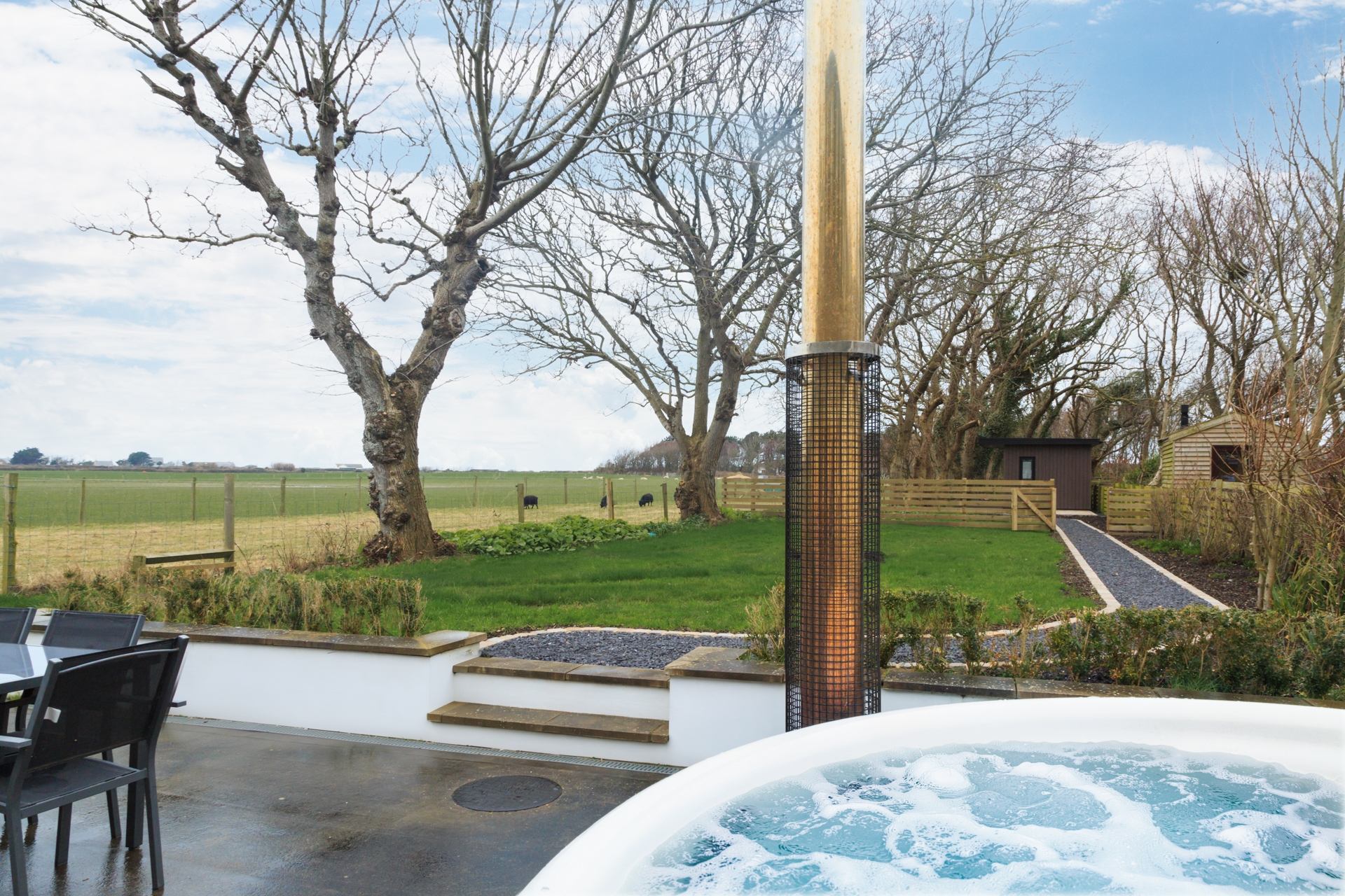 A wood-fired hot tub sits within a private patio area, complete with garden furniture, creating a secluded spot to relax and unwind. Whether soaking beneath the stars after a day exploring the island or enjoying a quiet drink outdoors as the sun sets over the fields, this inviting space adds a touch of understated indulgence to your stay.