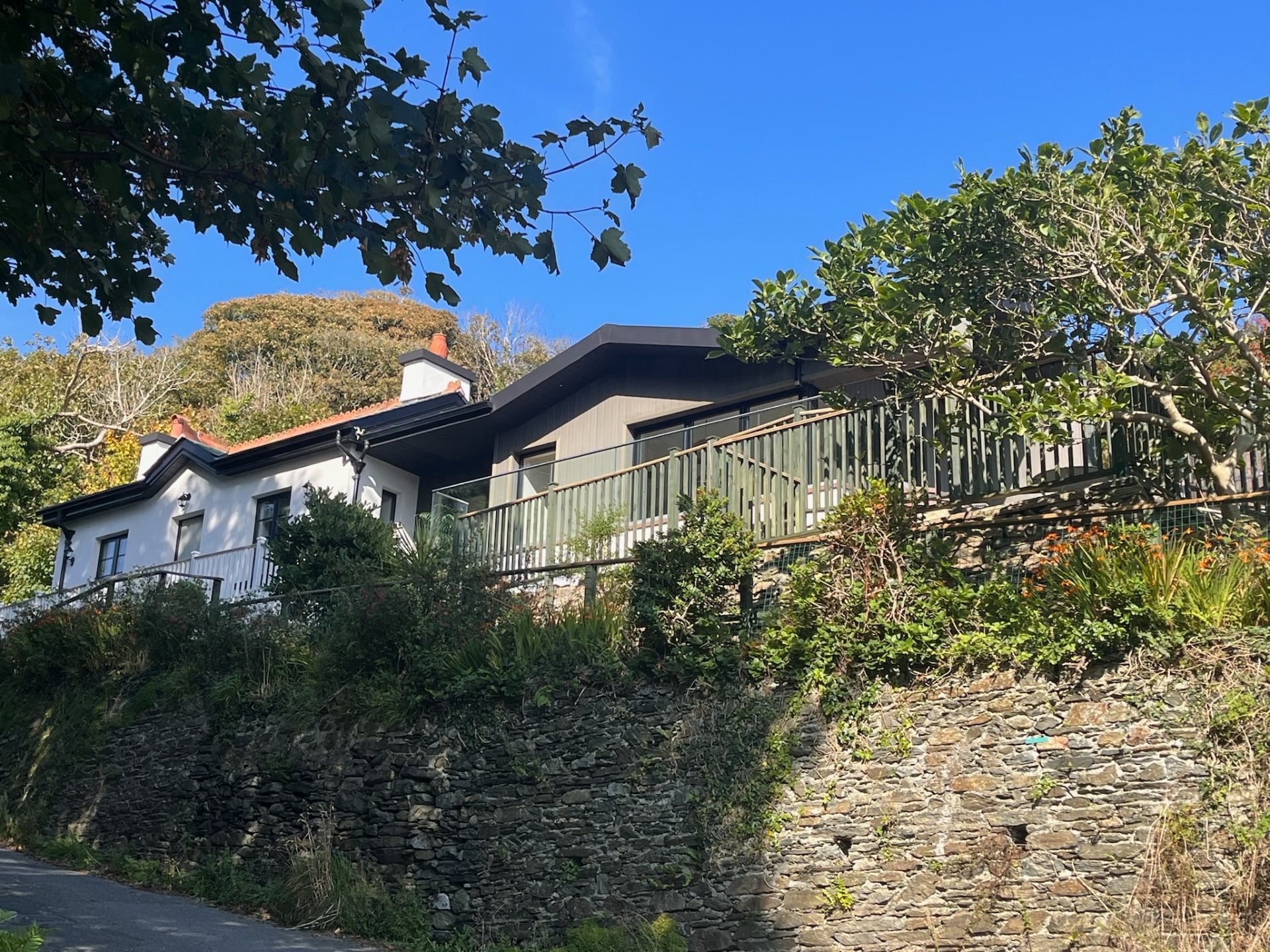 From the exterior, the cottage keeps much of its original character , with the addition of a south-facing living space and terrace in contemporary style, with exterior panelling, also featuring Manx stone steps to the various levels.