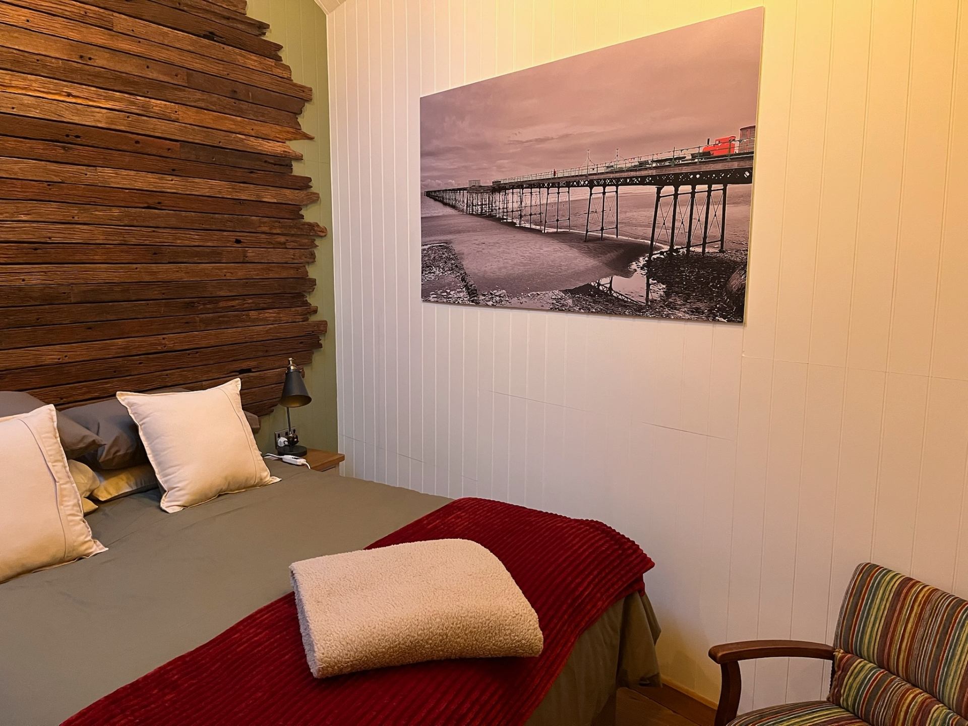 The cottage has two bedrooms, which both feature vaulted ceilings and wood panelling - some of which has been preserved and restored from the original cottage.