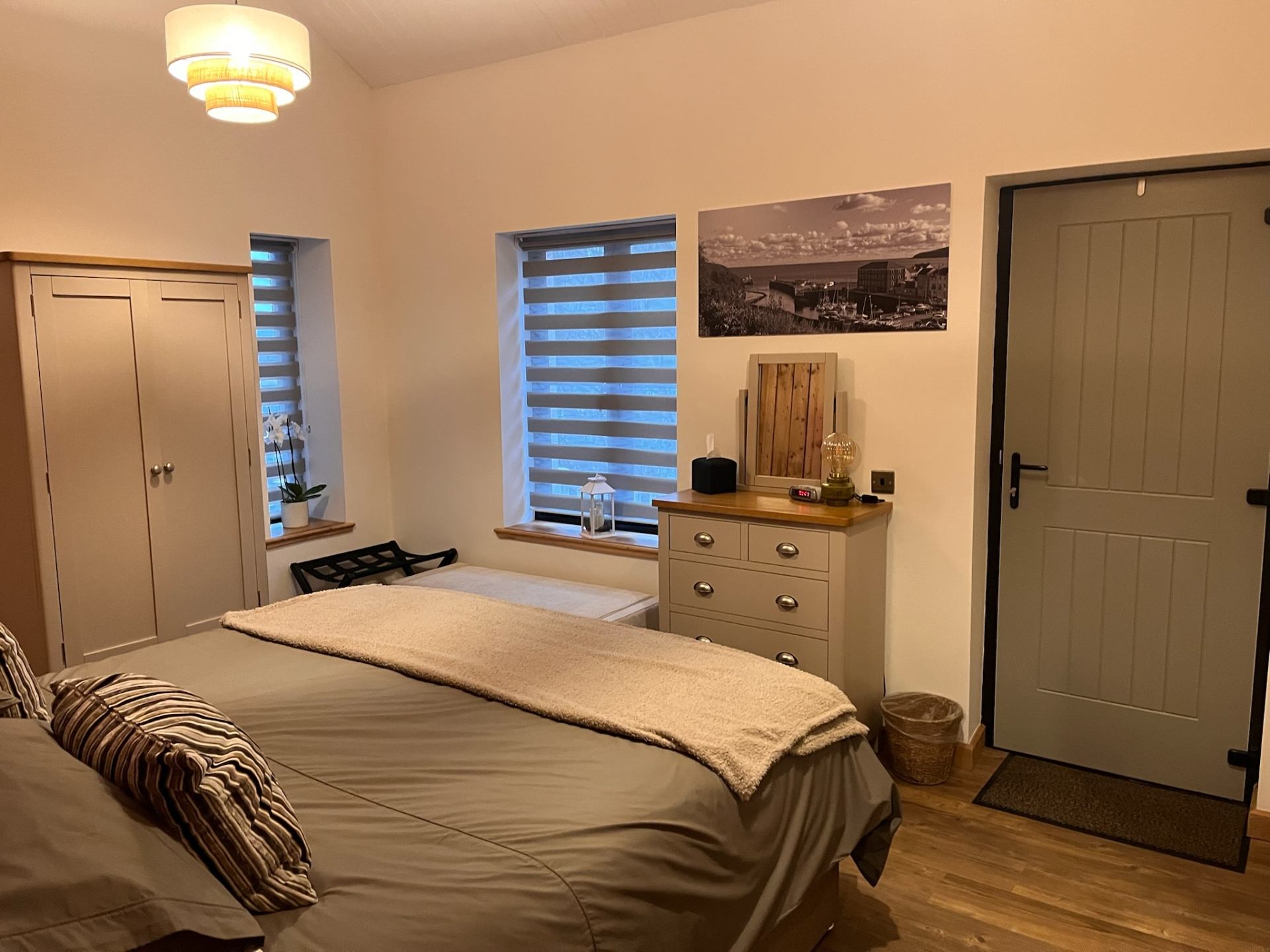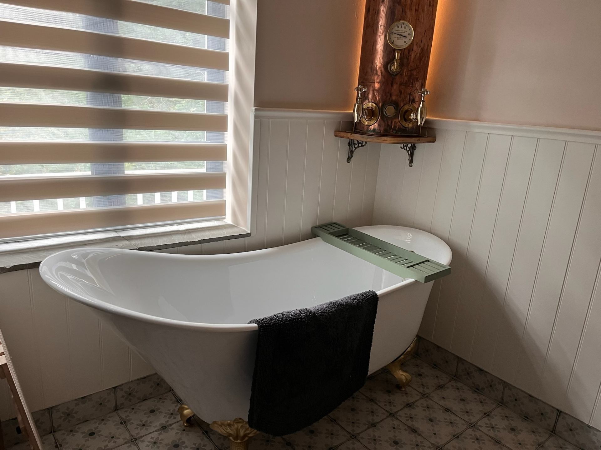 The Laxey Bay room’s ensuite walk-in wet room features the original hot water cylinder from the cottage's past, which has been cleverly adapted into the bath's water supply. The walk-in shower includes waterfall, rainfall, and handheld modes.