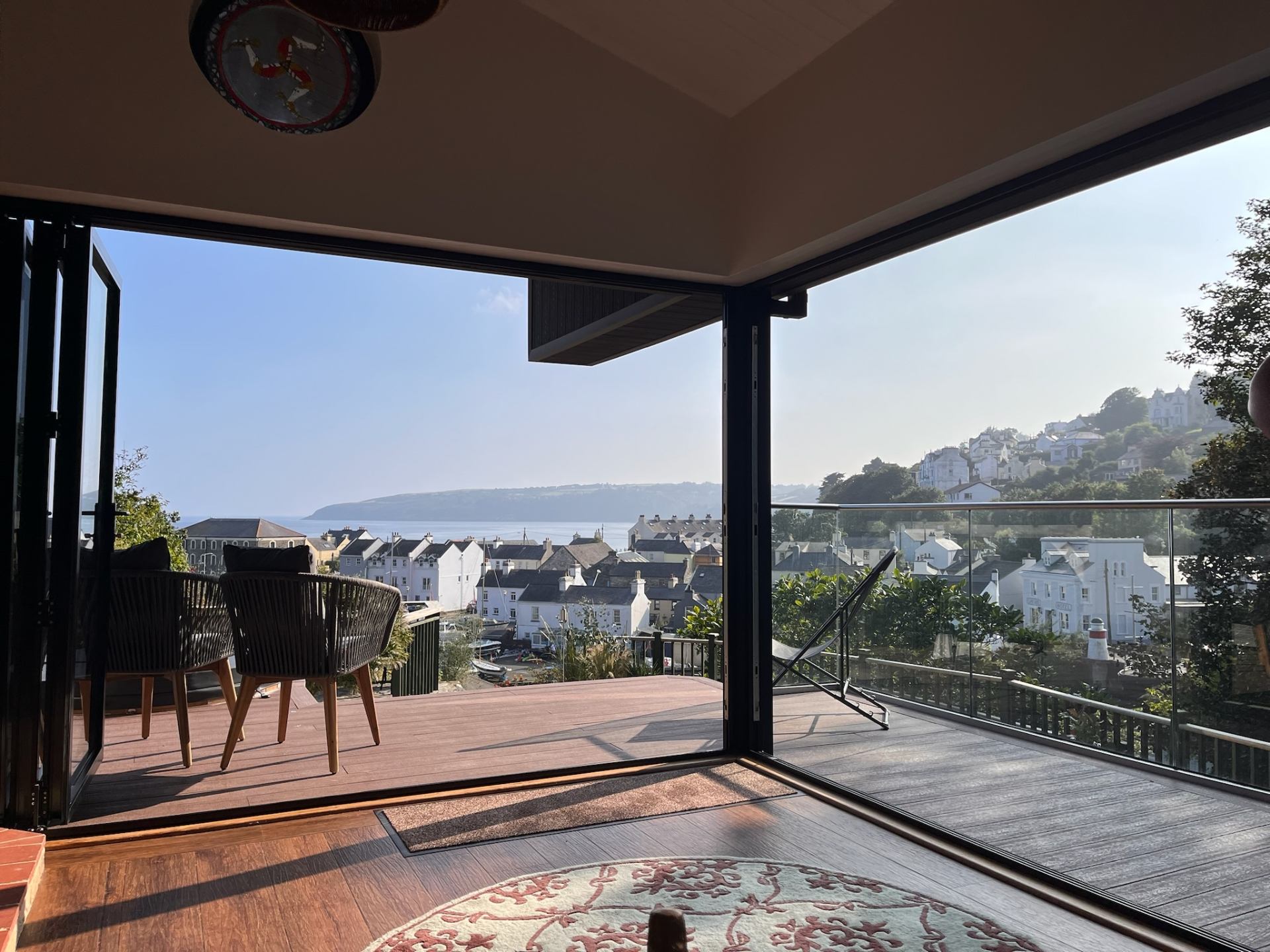 This room is dominated by the two large bifold doors, which provide striking panoramic views of Old Laxey harbour and beach.