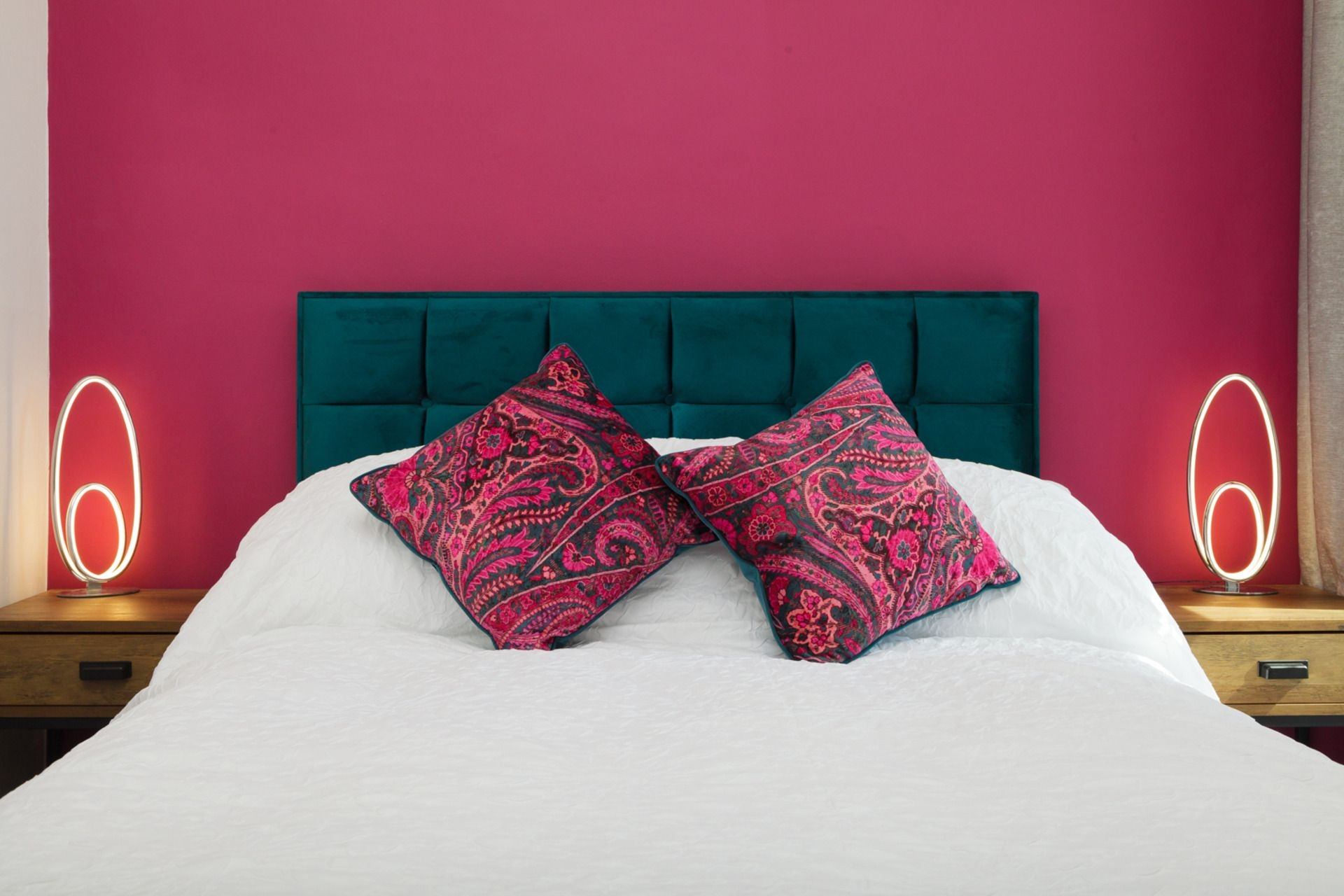 Bedroom 1: Double bed, bedside tables, hanging space