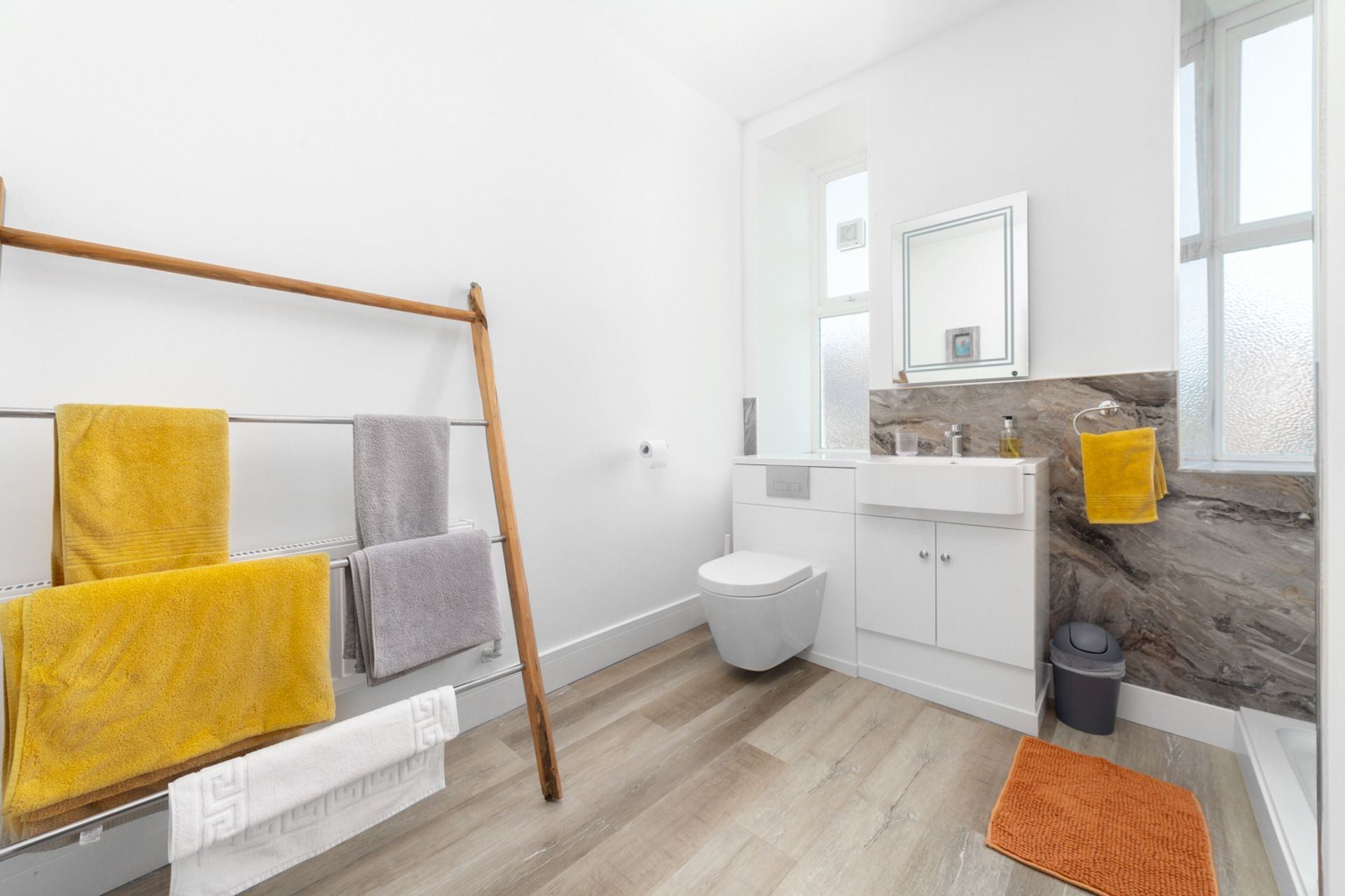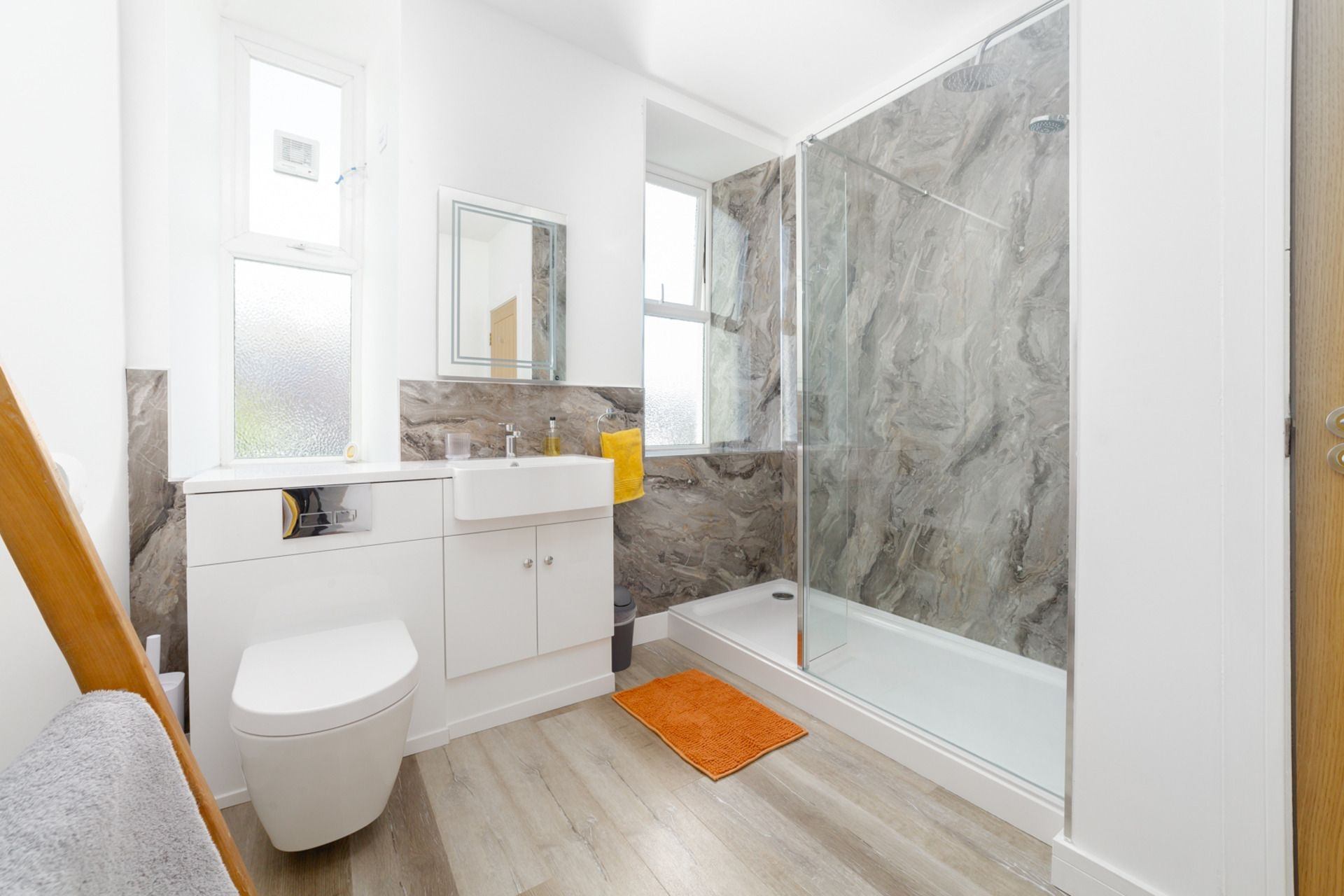 Bathroom: Walk- in shower, w.c., basin and vanity unit