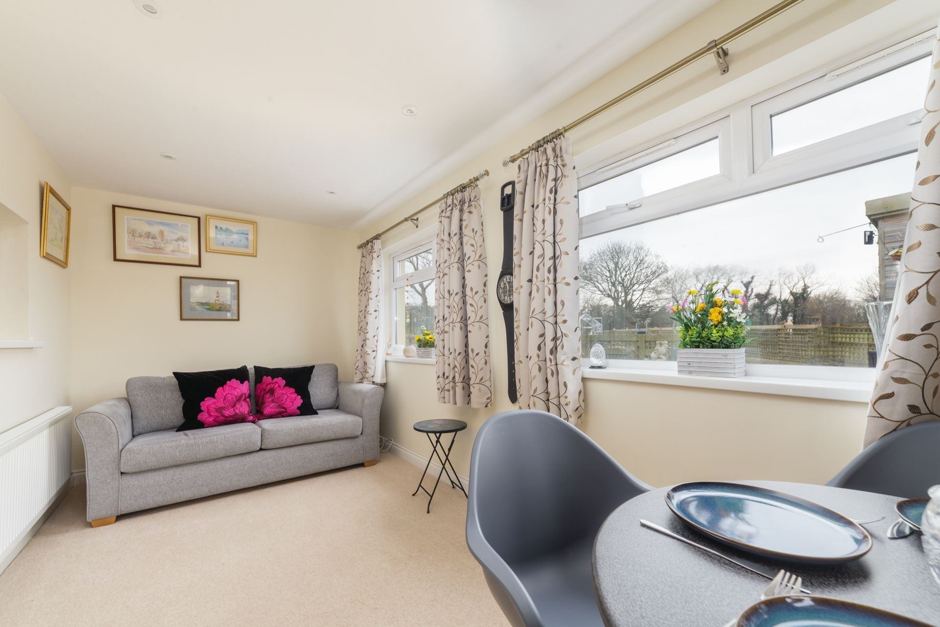 Living area: One two seater sofa, two armchairs, coffee table, Smart TV and electric fire.