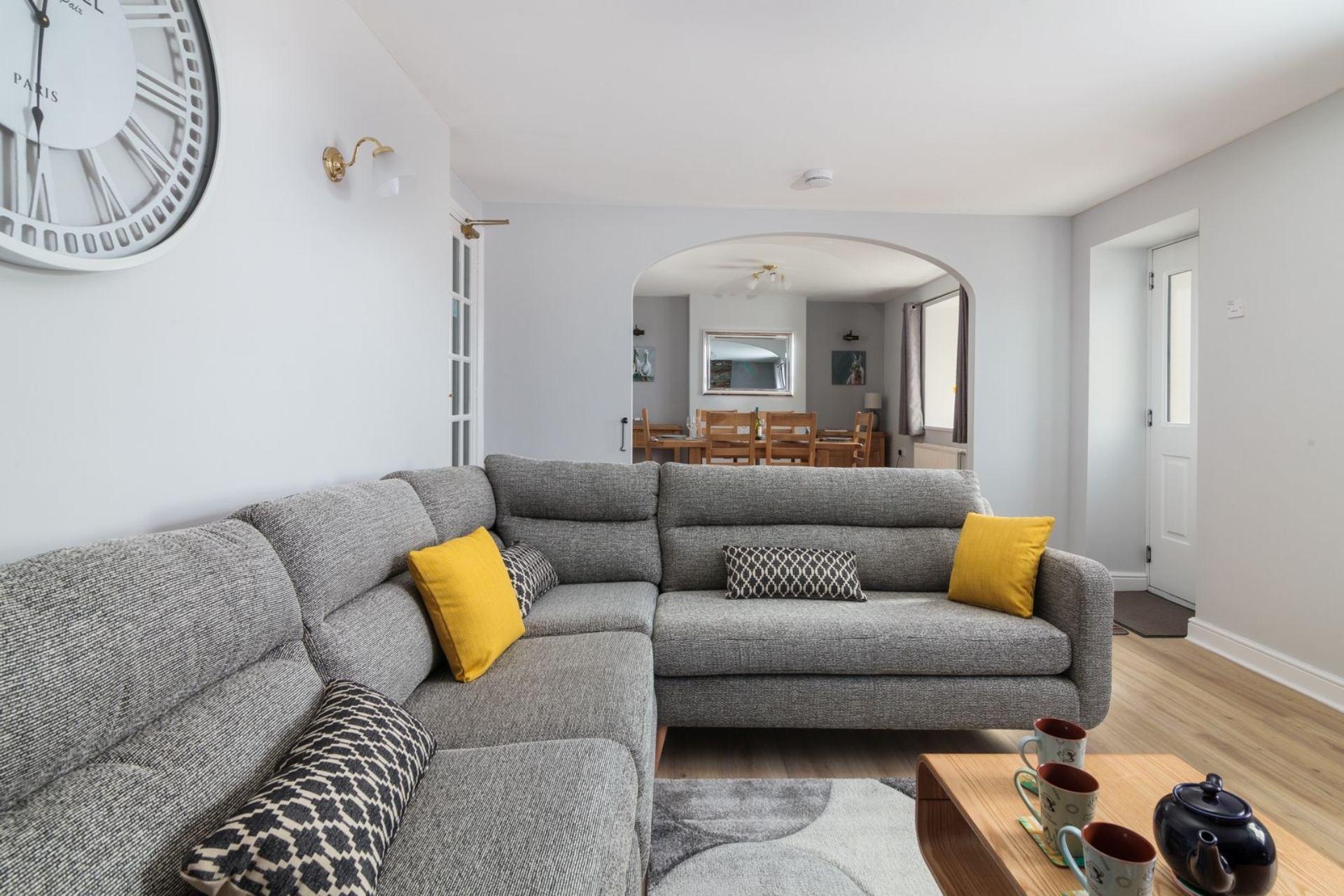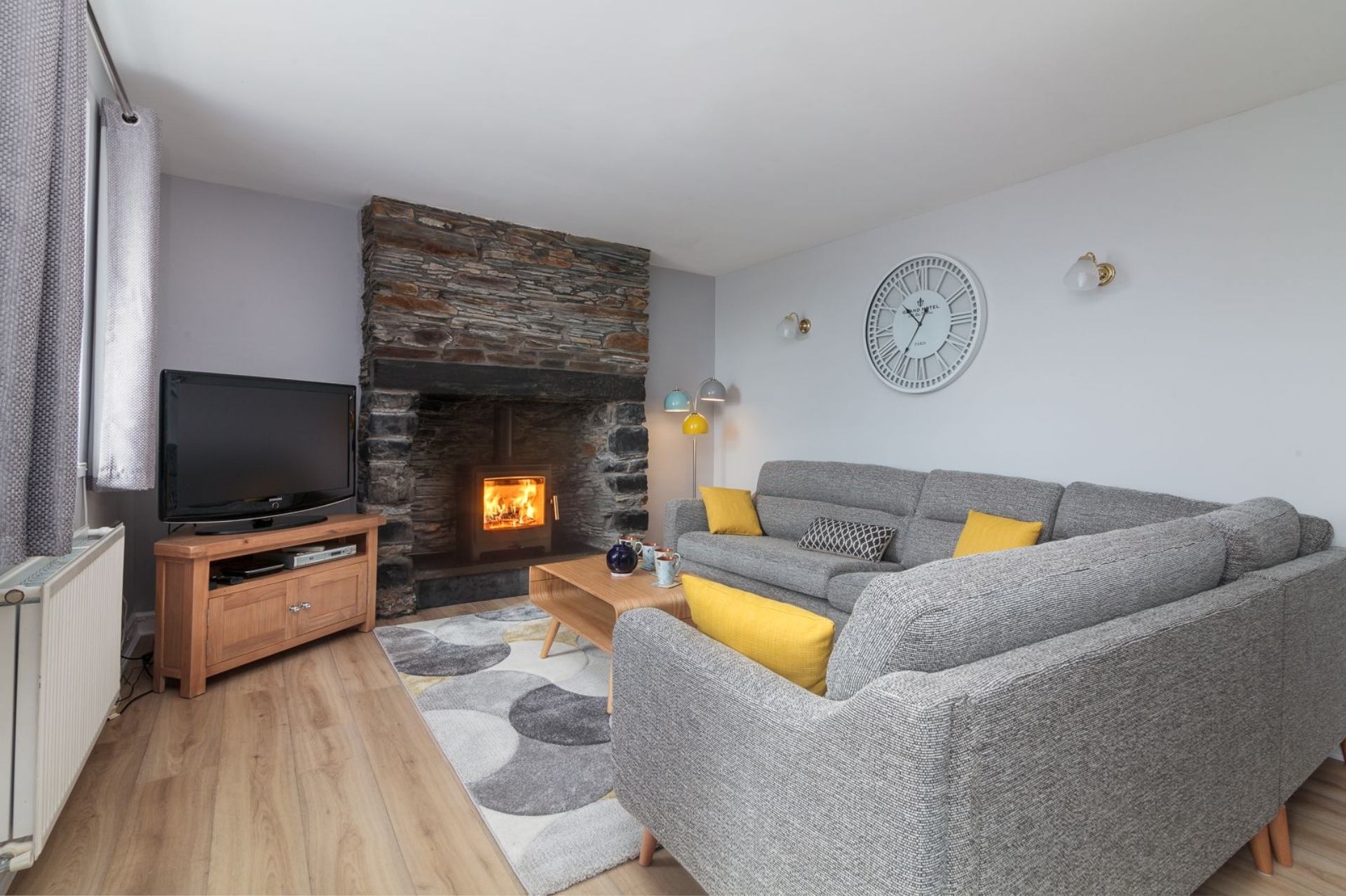 Lounge/Dining room: Comfortable corner sofa, coffee table, Smart TV, log burner, dining table and six chairs.