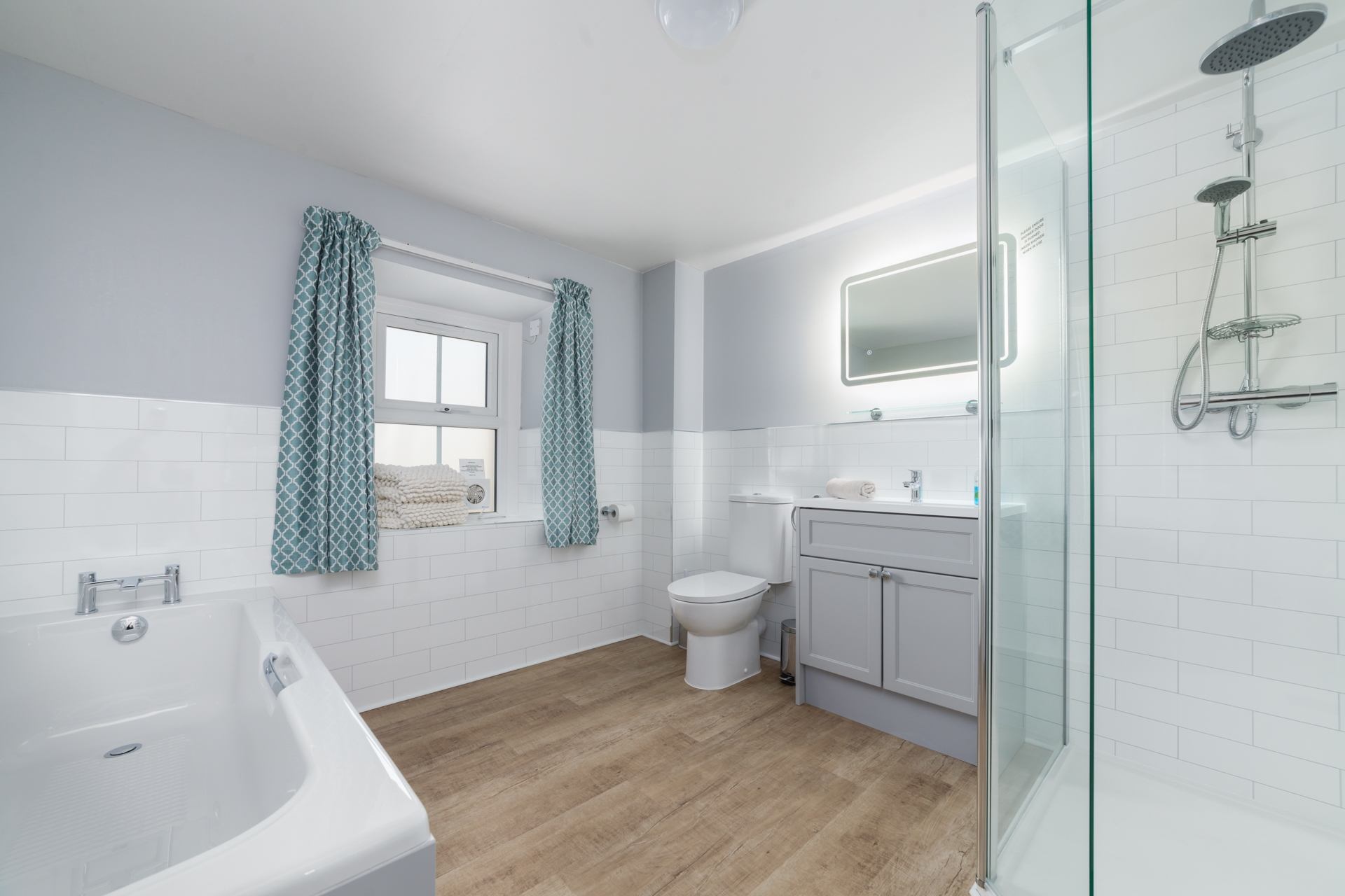 Family Bathroom: Bath, separate corner shower, w/c and washbasin.
