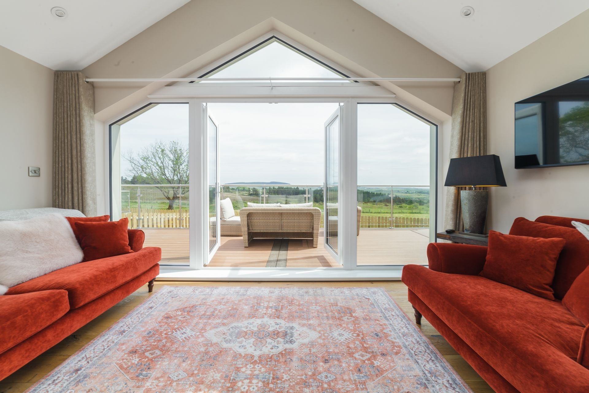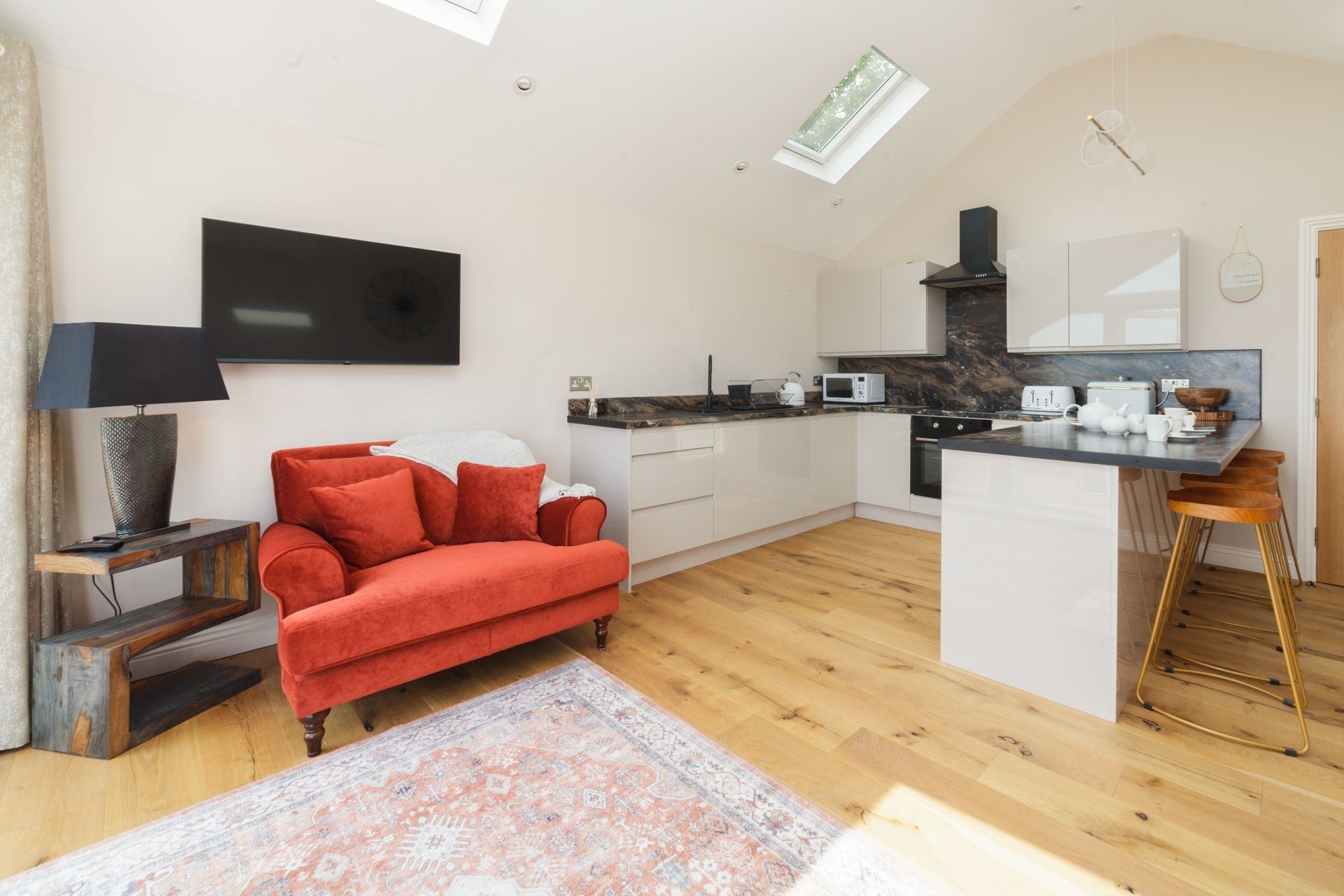 Living Area: Bright and comfortable with smart TV, sofa, and two cosy armchairs.