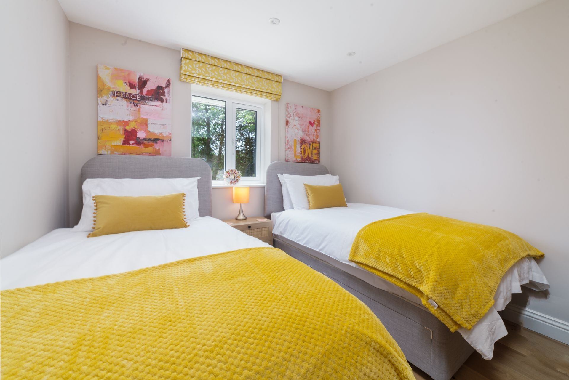 Bedroom 2: Twin beds, Smart TV, bedside table and wardrobes.