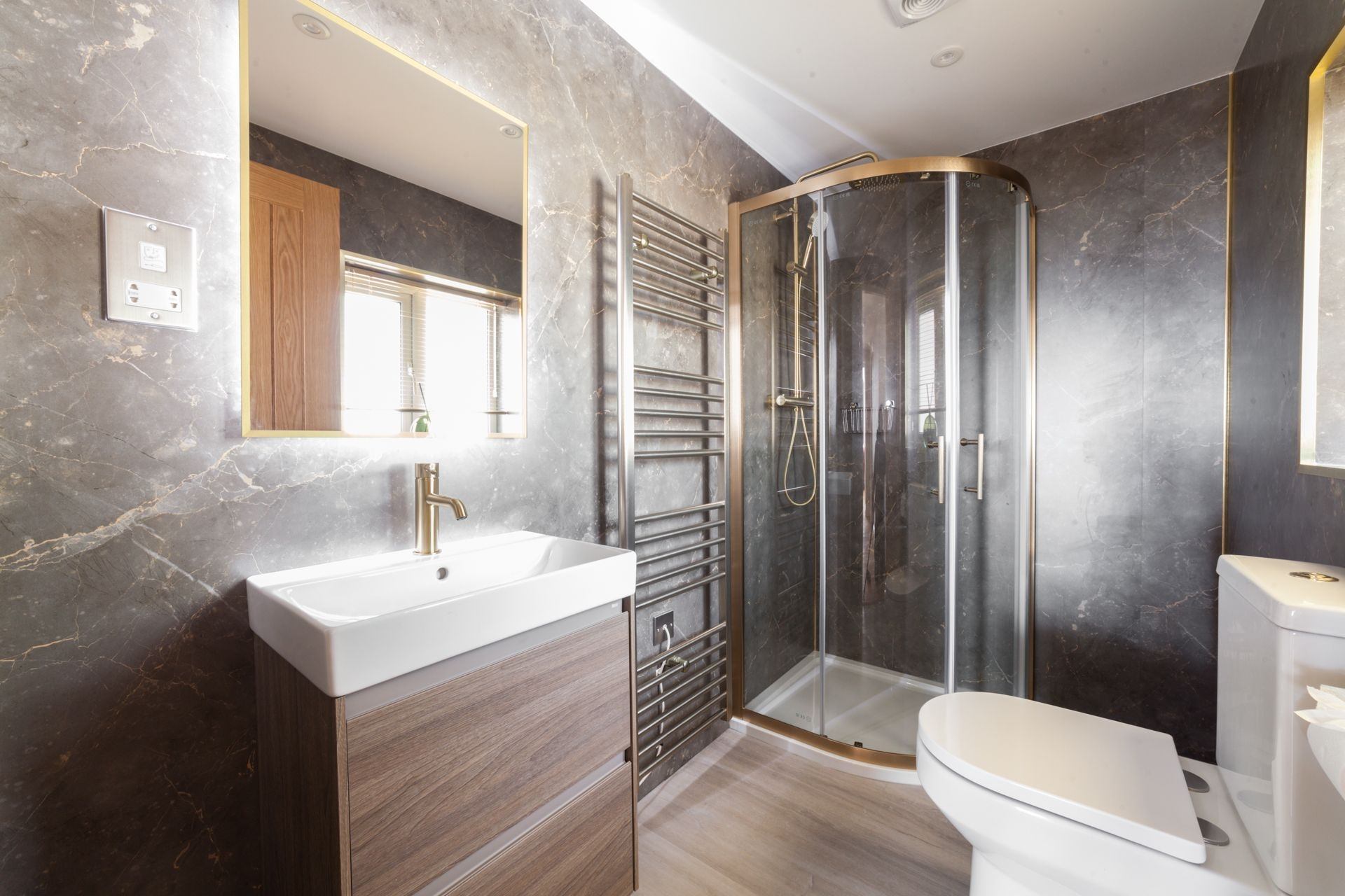 Bathroom: Walk-in shower, WC, heated towel rail and wash basin.