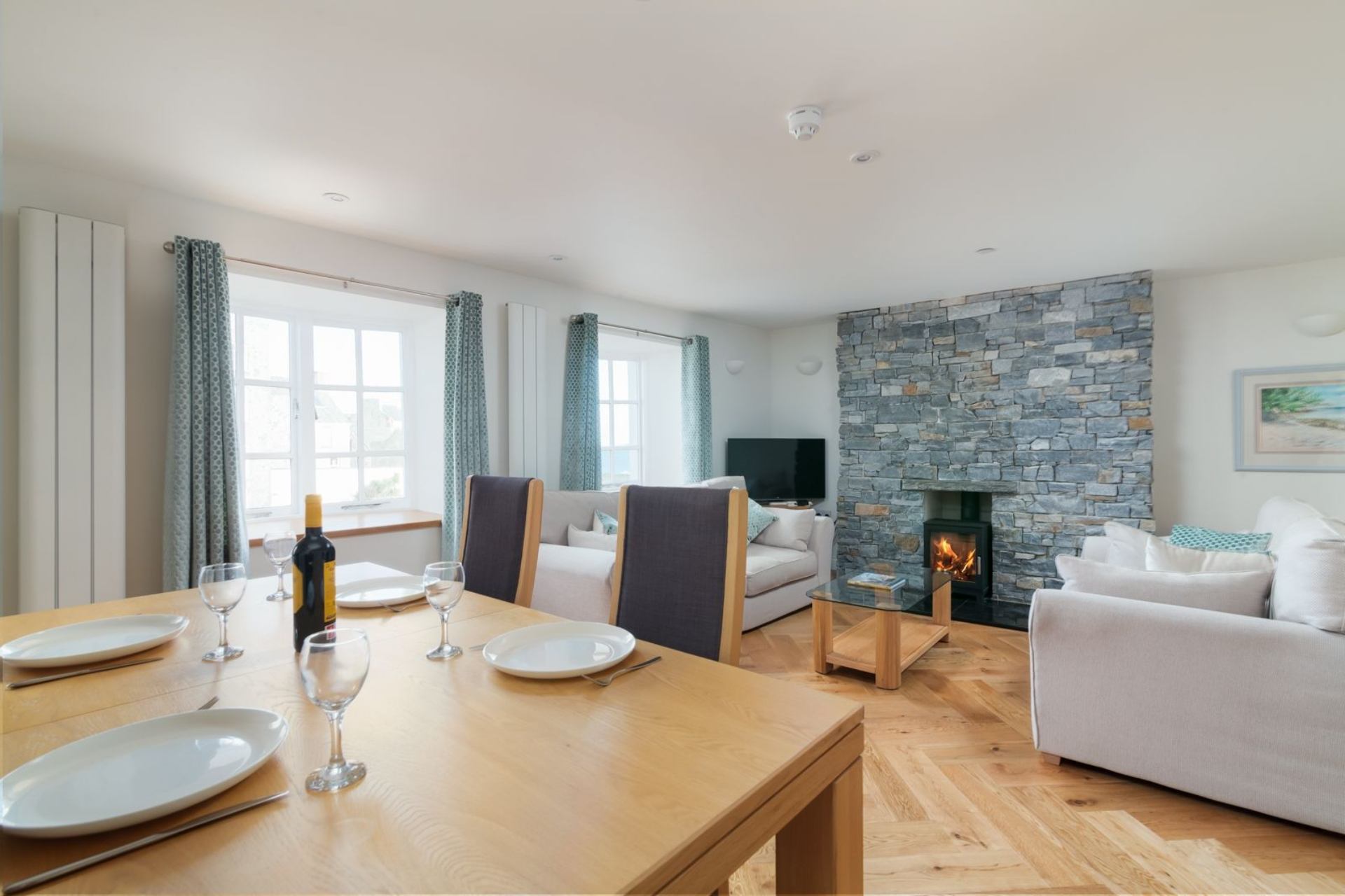 Lounge/Dining area: Two sofas, Dining table and 5 chairs, Apple TV, coffee table, log burner.