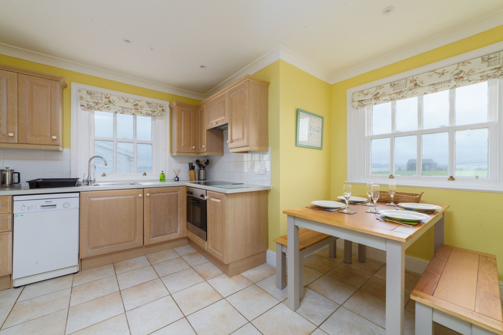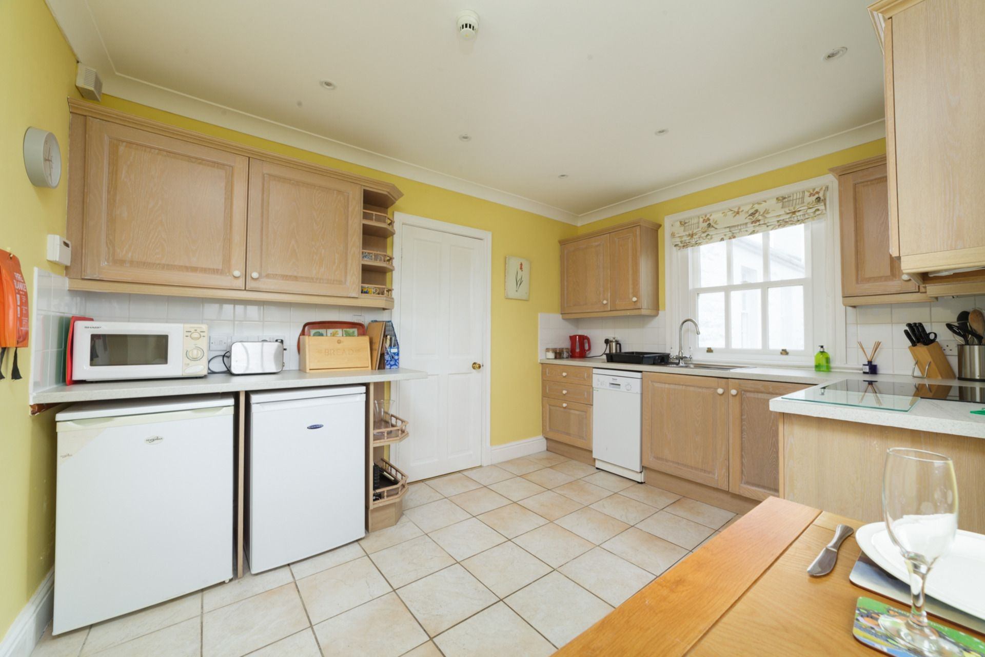 Kitchen: Well-equipped kitchen, featuring oven, hob, microwave, toaster, fridge and freezer. Dining area contains table and seating for 8 people, with a large Smart TV. Access to outdoor area via large French doors.