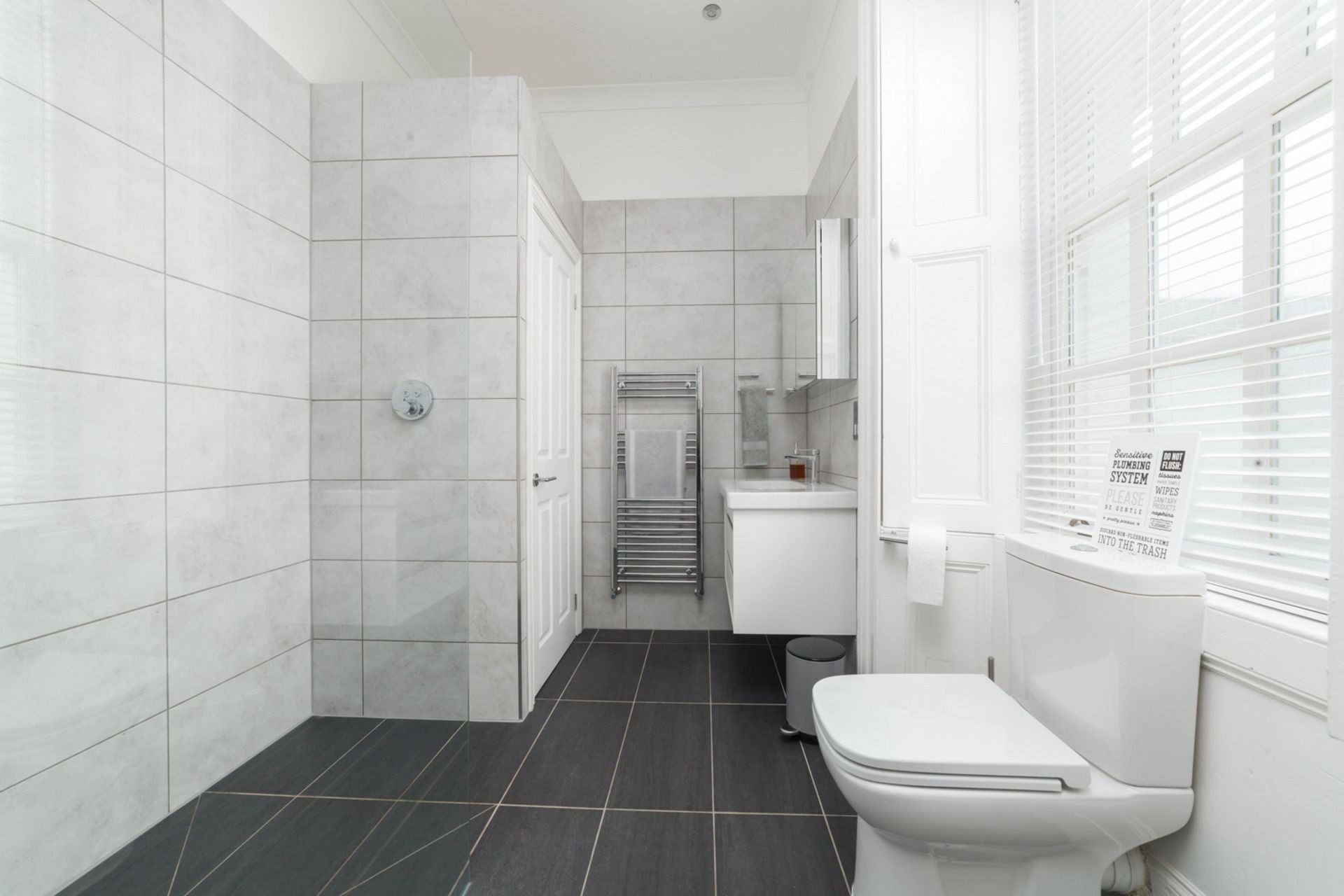 Bathroom: Walk-in shower, sink, WC and laundry facilities.