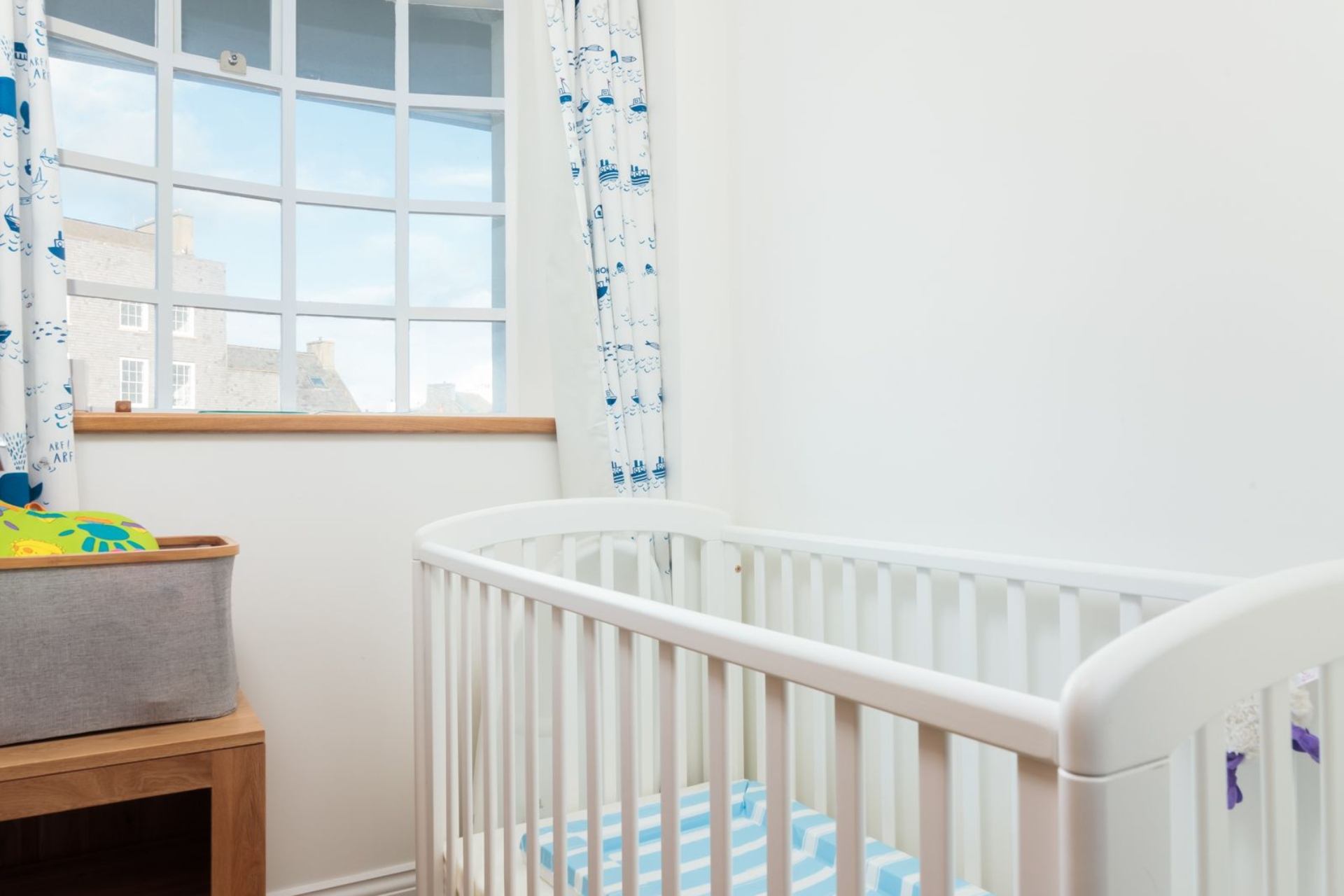 A beautiful location with a big balcony window giving a 180 degree view over the harbour and across to Langness. Perfect for watching the sunrise, or the swans or seabirds at any time. \nCosta is a 20 second stroll and a variety of pubs and restaurants not much further. Despite that it is extremely quiet as the street the house is located on just runs down to a small pier. Lots of lovely walking opportunities from the front door. \nTop quality fittings, with the exception of the tv, which offered Apple TV (subscription required), or a very contrary bbc iplayer. \nThere is a small nursery, with a cot, and a high chair supplied, but I would be wary of having a child capable of crawling or walking due to the open plan nature of the top floor living area which opens straight on to the stairs. The house is over 3 floors, with a bedroom in each floor, and the living area on the top,\nDefinitely worth a visit!\n