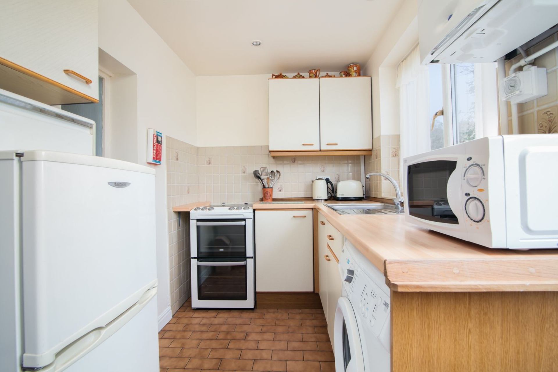 Kitchen: Containing cooker and hob, microwave, fridge/freezer, washing machine.