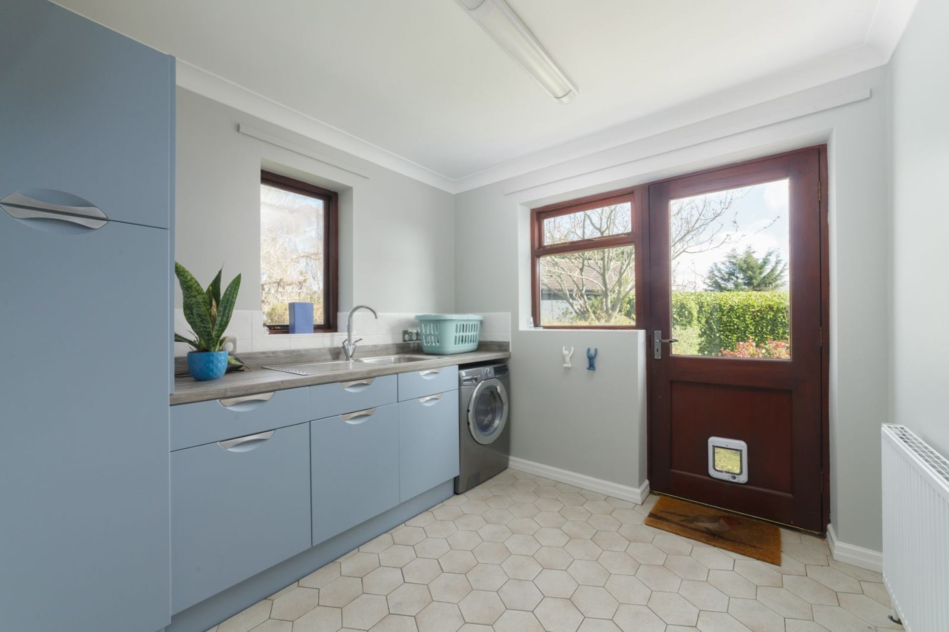 Utility room: Basin and combined washer/dryer. Iron and ironing board.