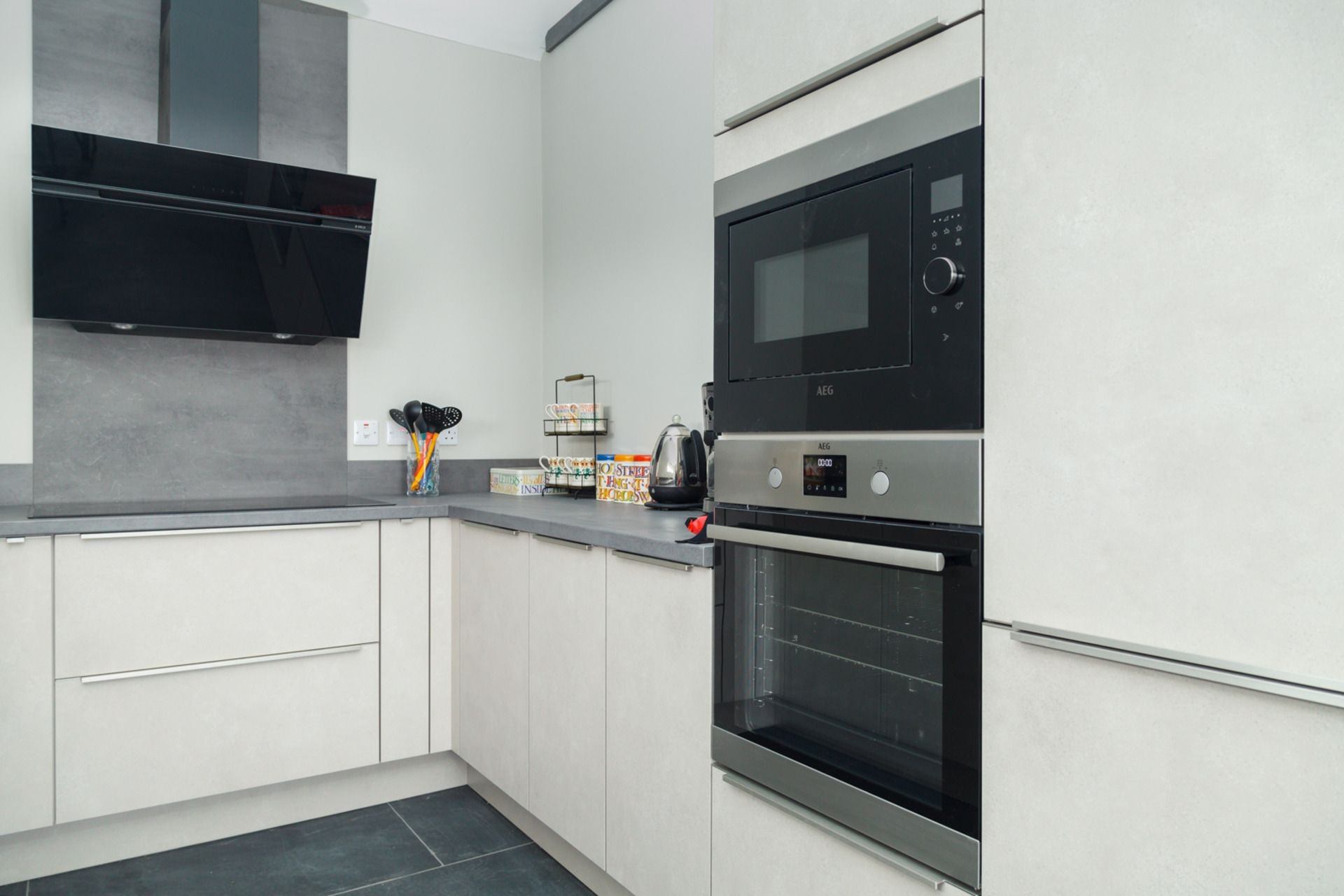 Kitchen: Fully equipped with ceramic hob, oven, microwave and fridge. Seating for 6 at dining table. Access to outdoor area via French doors.