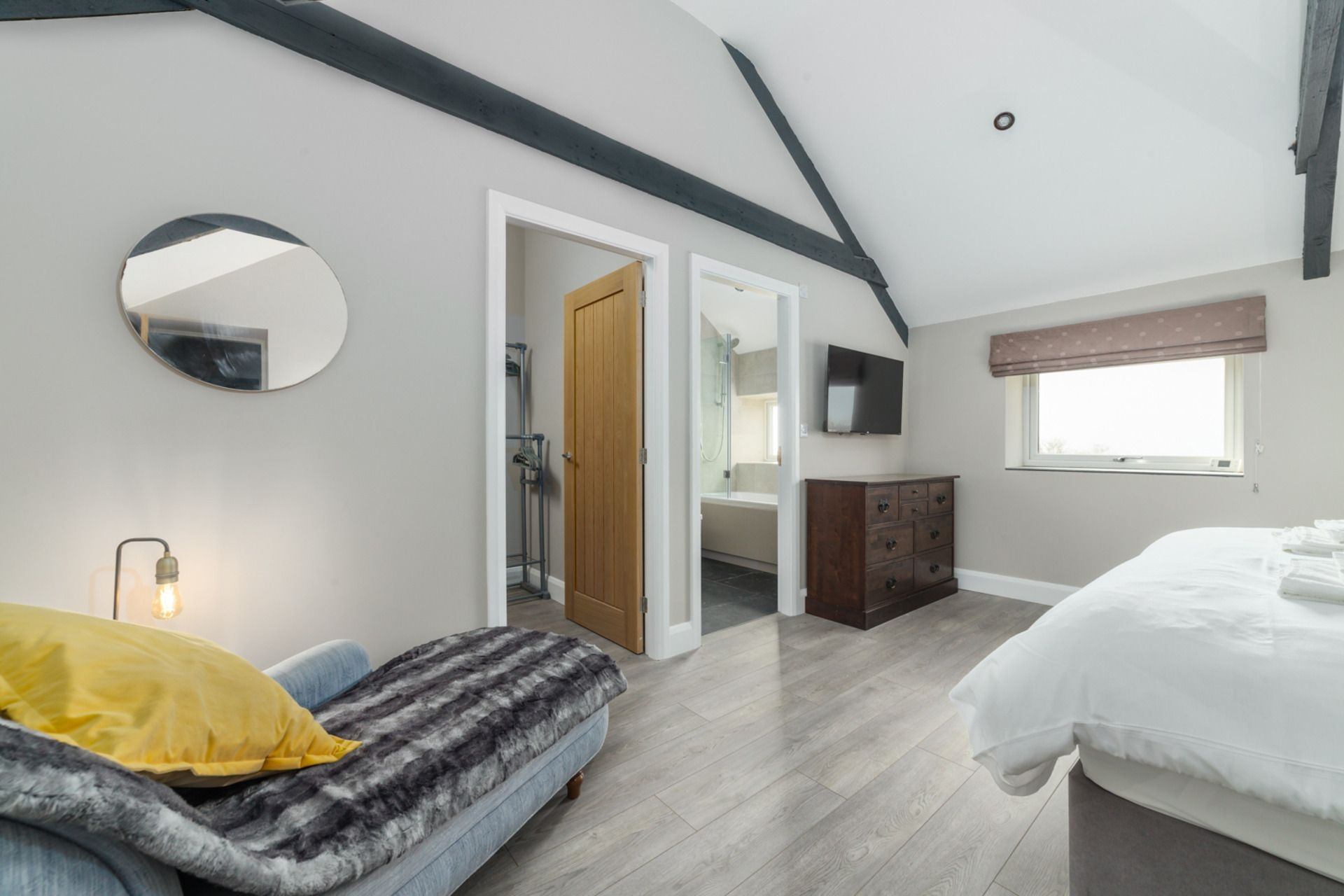 Bedroom 1 : Super king bed, bedside cabinets, chaise longue, chest of drawers and TV.