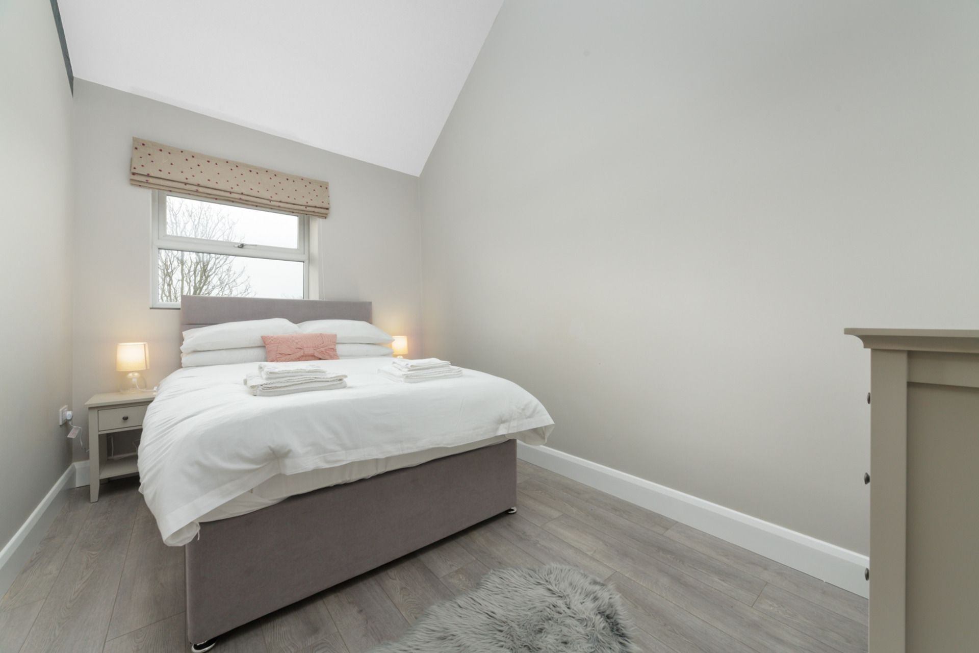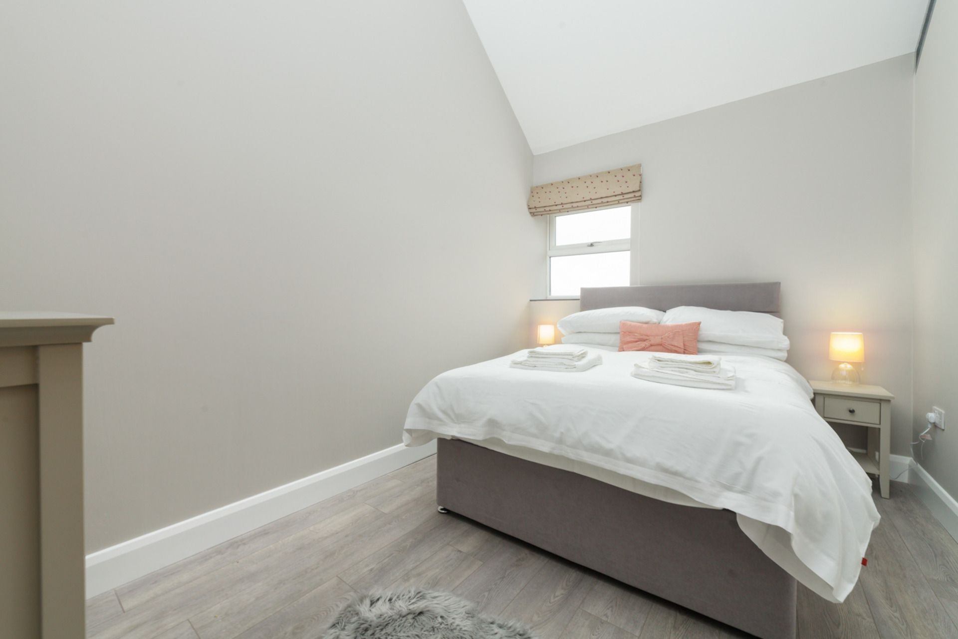 Bedroom 2: Double bed, bedside cabinets, chest of drawers, hanging space.