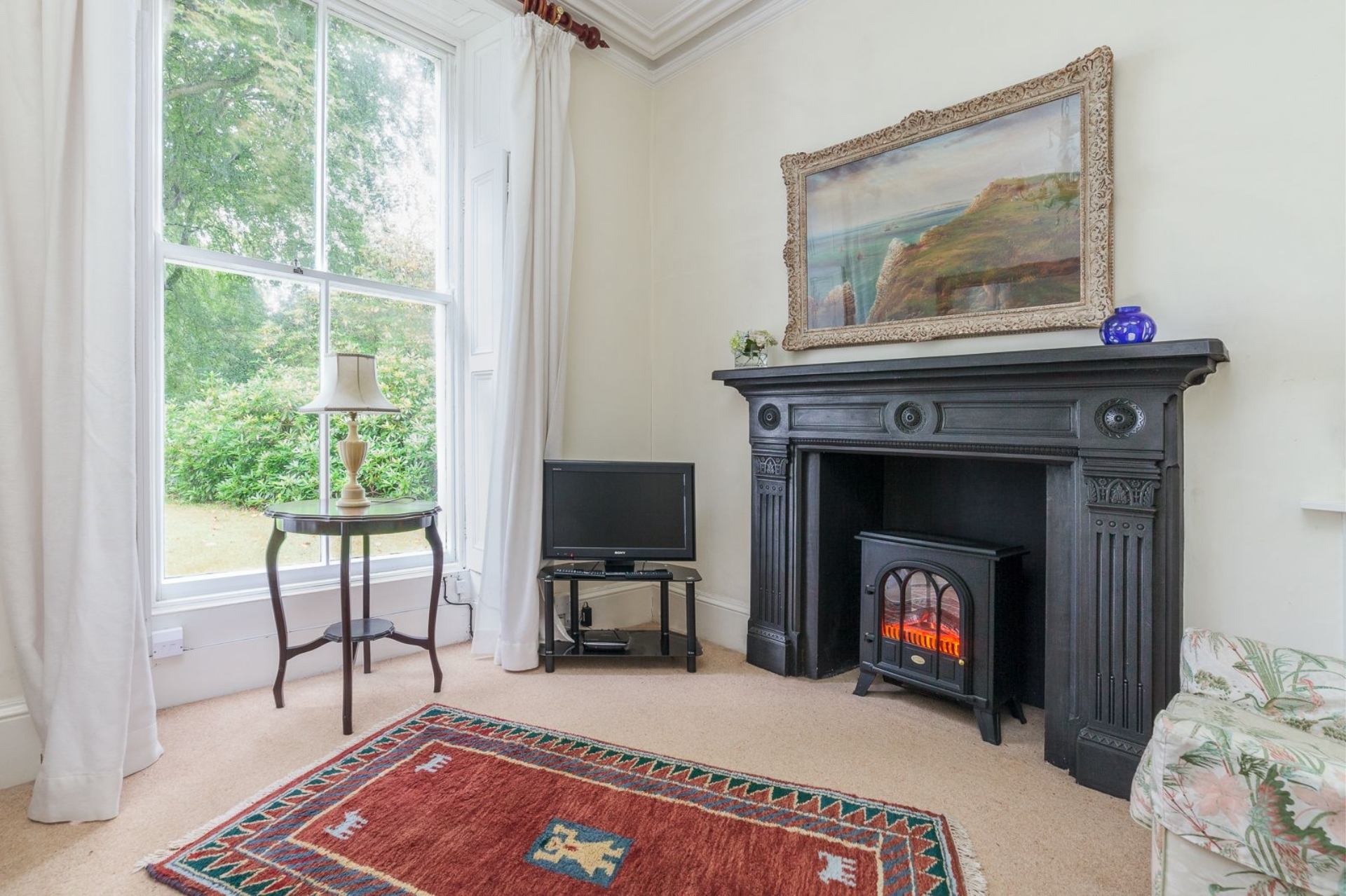 This is a beautifully presented period property, with high ceilings and many period features, a separate wing of a Victorian mansion. It had only recently been decorated throughout. The peaceful view from the very large double bedroom is across a lawn bounded by trees, yet the property is only a few minutes by car from the seafront or around a 25 minutes walk, though it\'s quite a steep climb coming back. The single bedroom (which we didn\'t use) is quite small but does benefit from a separate private dressing area. The sitting room was comfortable and relaxing, the kitchen/diner adequately equipped for the size of the property.\nThe property is on a couple of bus routes and we made some use of public transport as an alternative to driving. We found the Go Explore travel cards were good value for money, especially if you plan to use the island\'s heritage transport system.\nWhilst let through an agency, we happened to meet the owner, who was charming and helpful. All in all, we had a very enjoyable stay at West View and it will definitely be our first choice of accommodation the next time we holiday on the wonderful Isle of Mann.