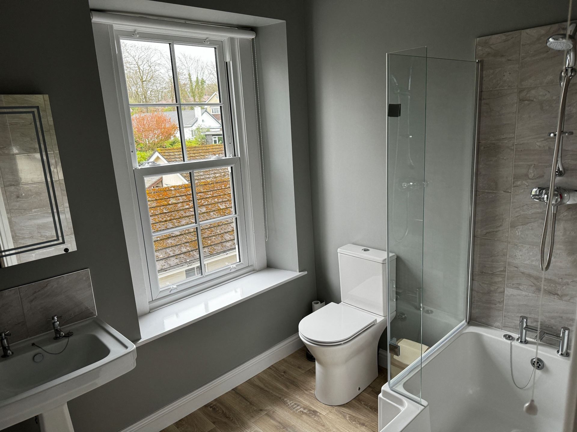 Bathroom: Bath with shower over, WC and wash hand basin.
