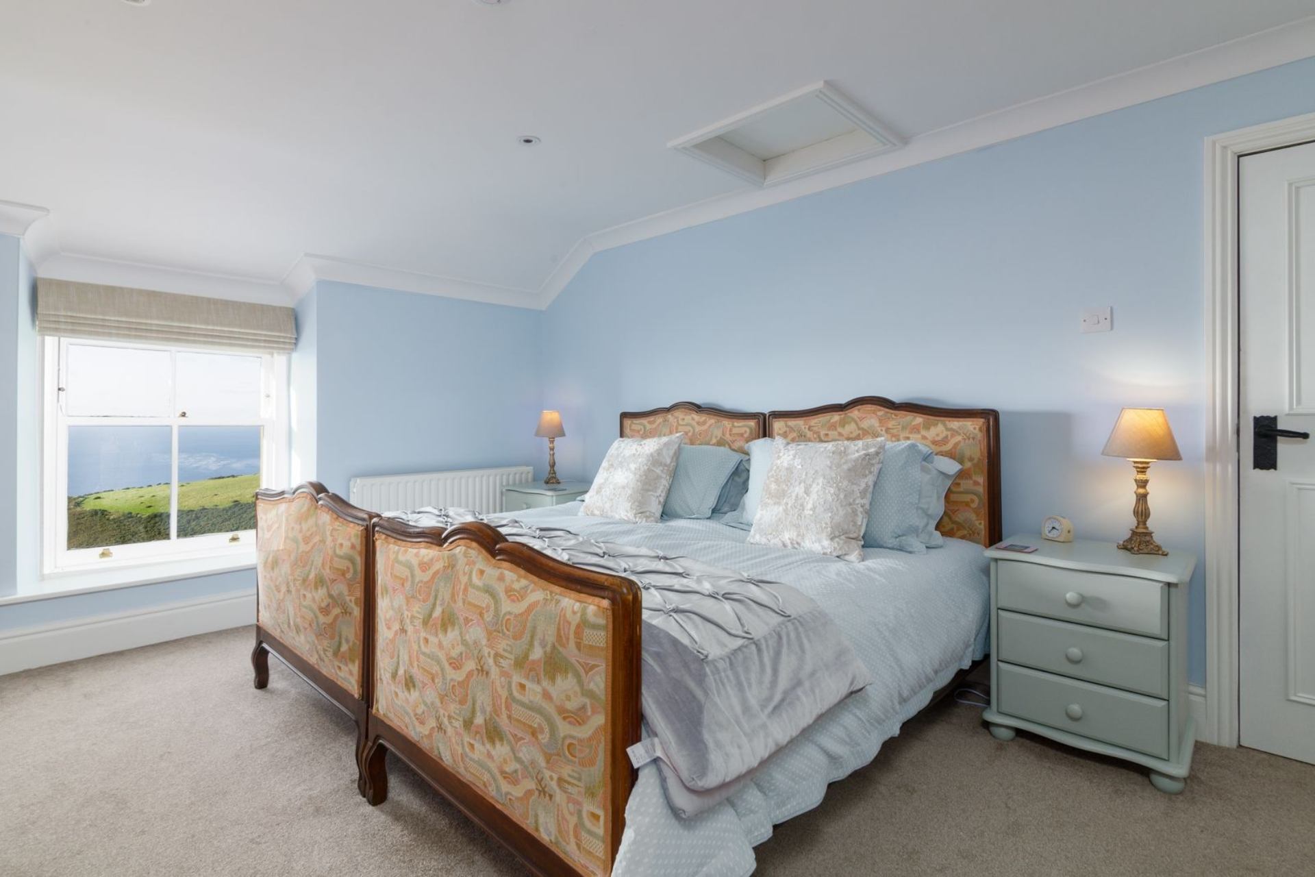 Bedroom 1: Super king size bed that can also be configured as a twin, bedside cabinets, chest of drawers, dressing table, wardrobe.