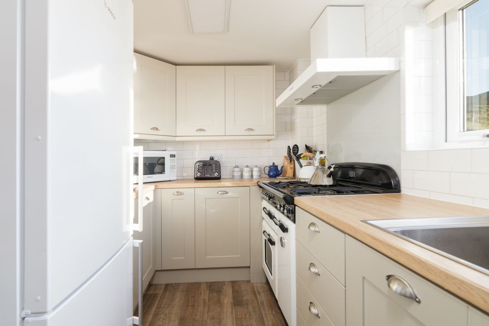 Kitchen: Electric oven, gas hob, fridge, freezer, dishwasher, microwave, toaster, breakfast bar and 7 stools.