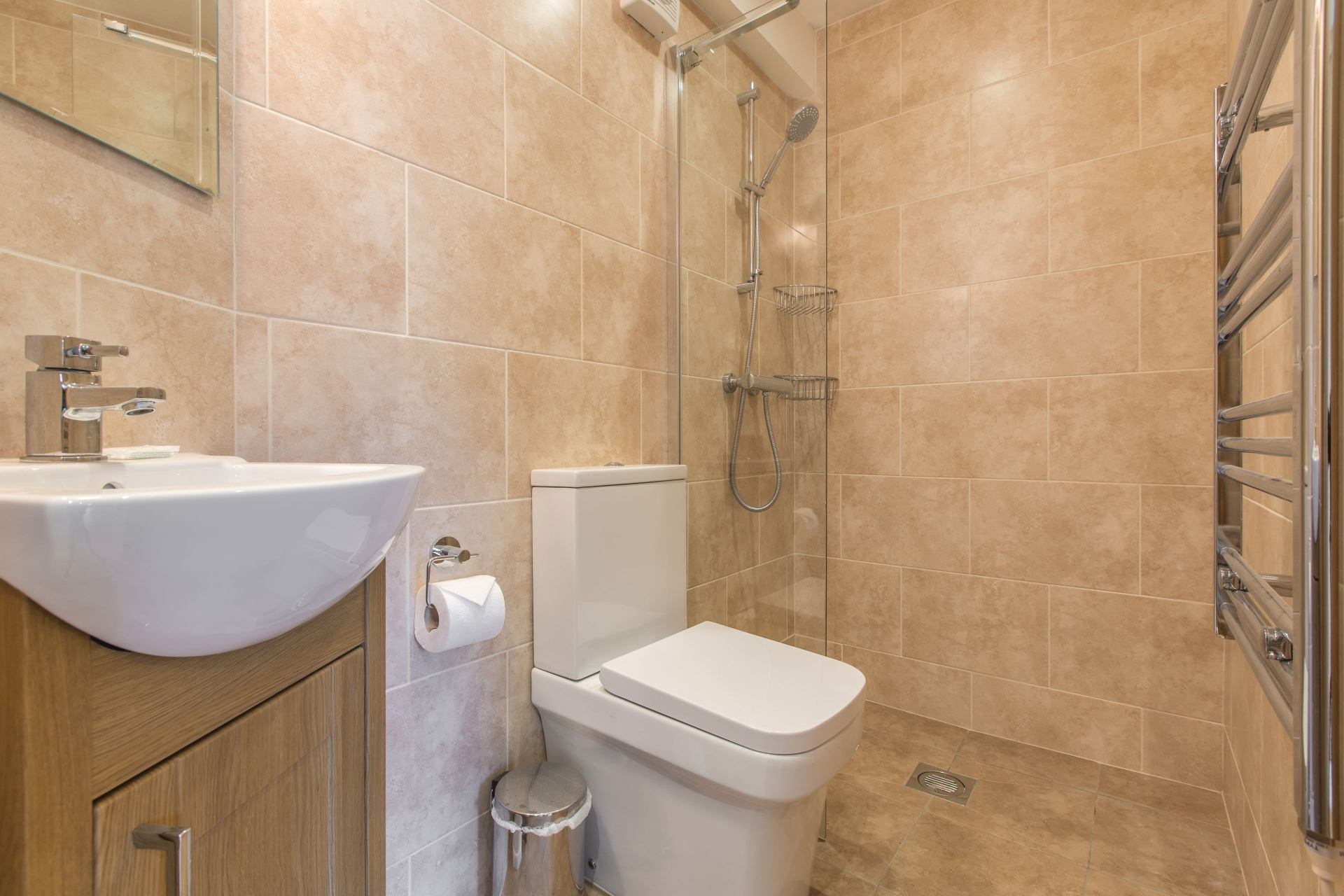 Family Bathroom: Wetroom on ground floor, with shower, WC and wash hand basin with vanity unit.
