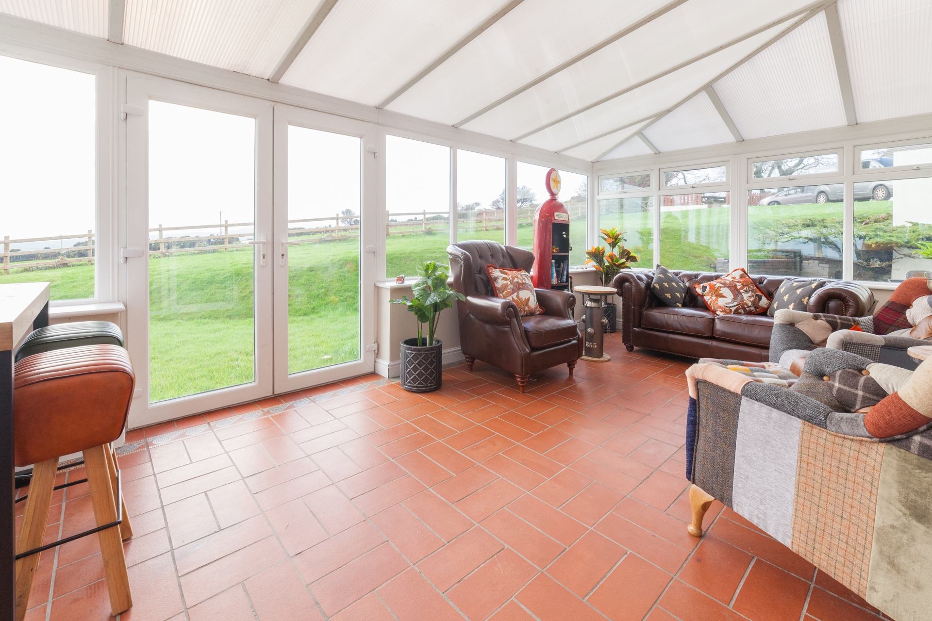 The inviting living room provides comfortable seating for the whole group, complete with a Smart TV and access to the airy conservatory, where you can unwind with informal seating and views of the central and northern Manx hills.