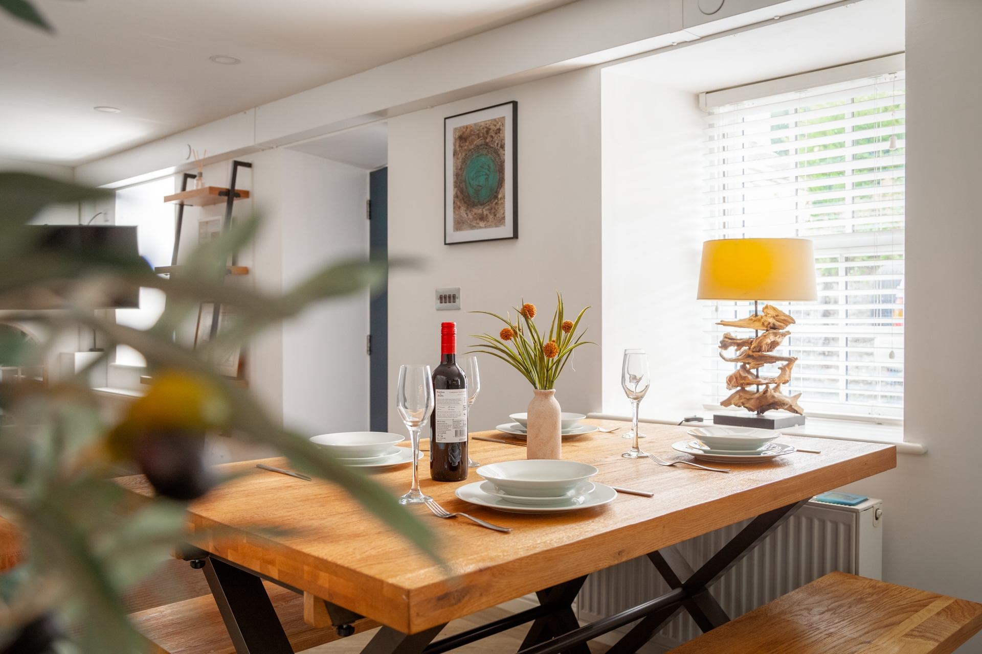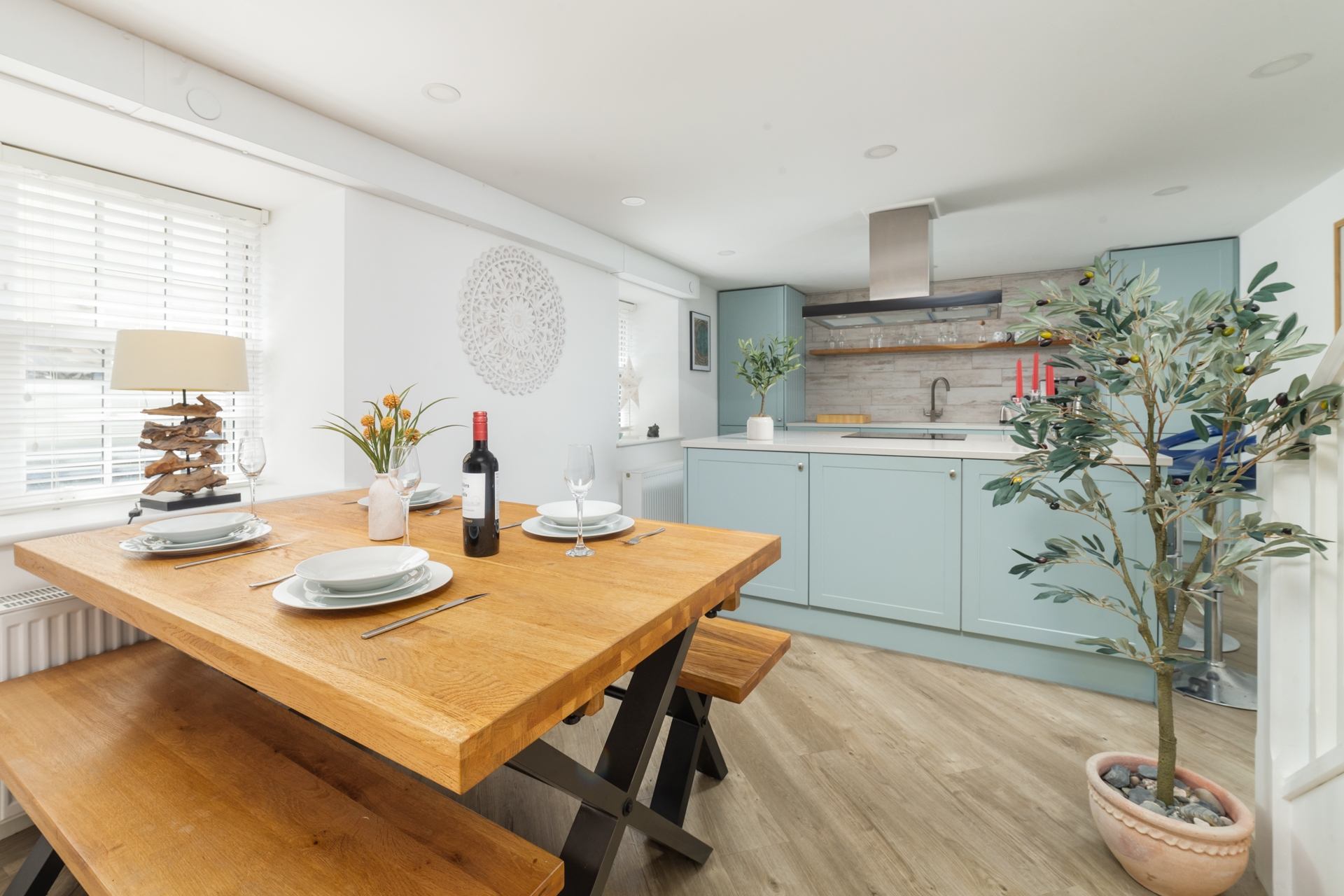 Dining Area: Dining table with bench seating for four people.