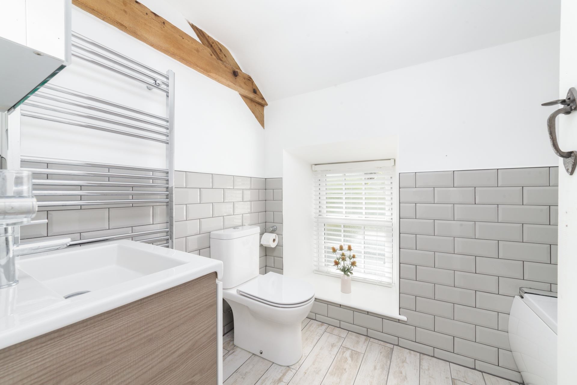 Family Bathroom: Shower over bath, WC and wash hand basin.