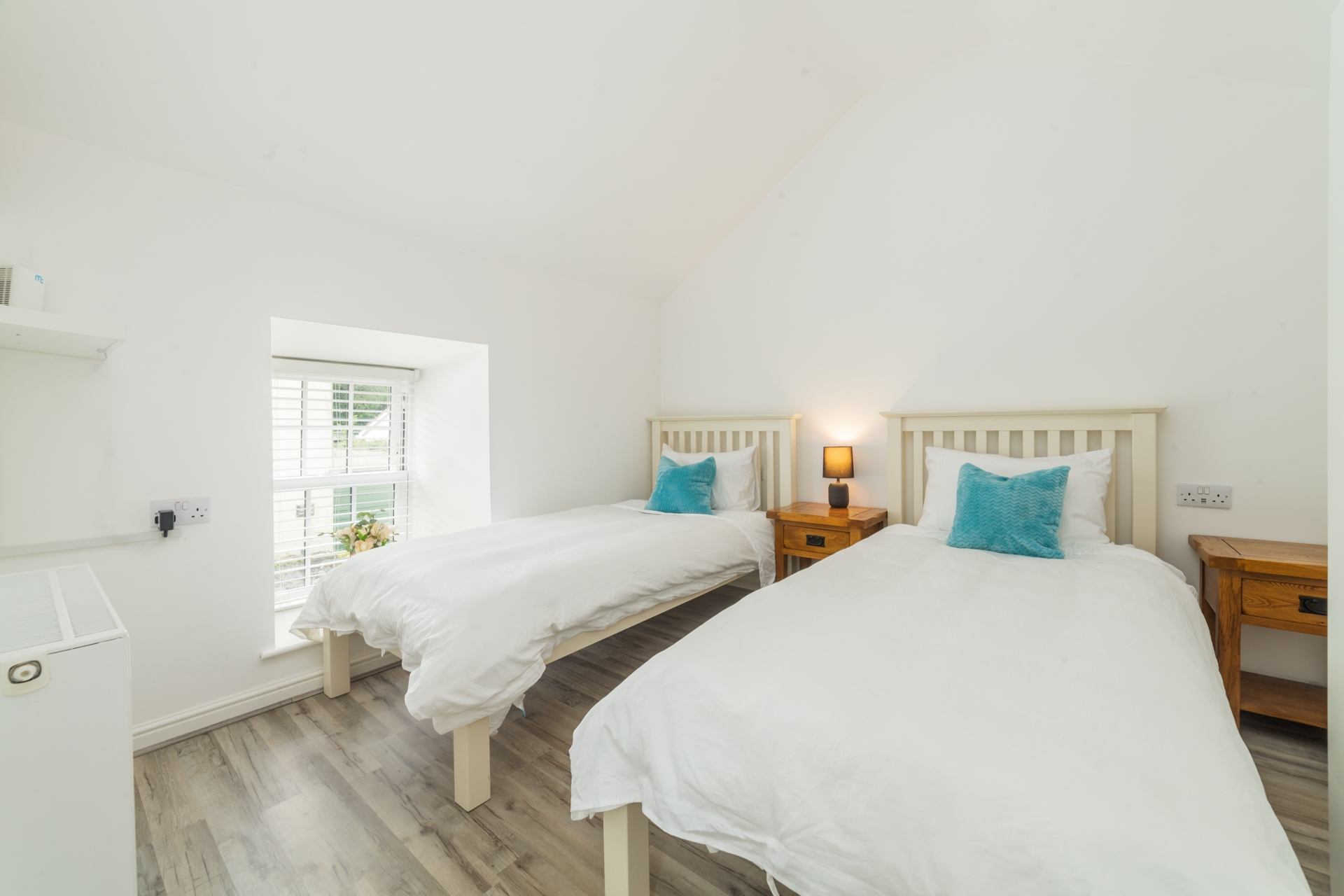 Bedroom 2: Twin beds, wardrobe and bedside table.